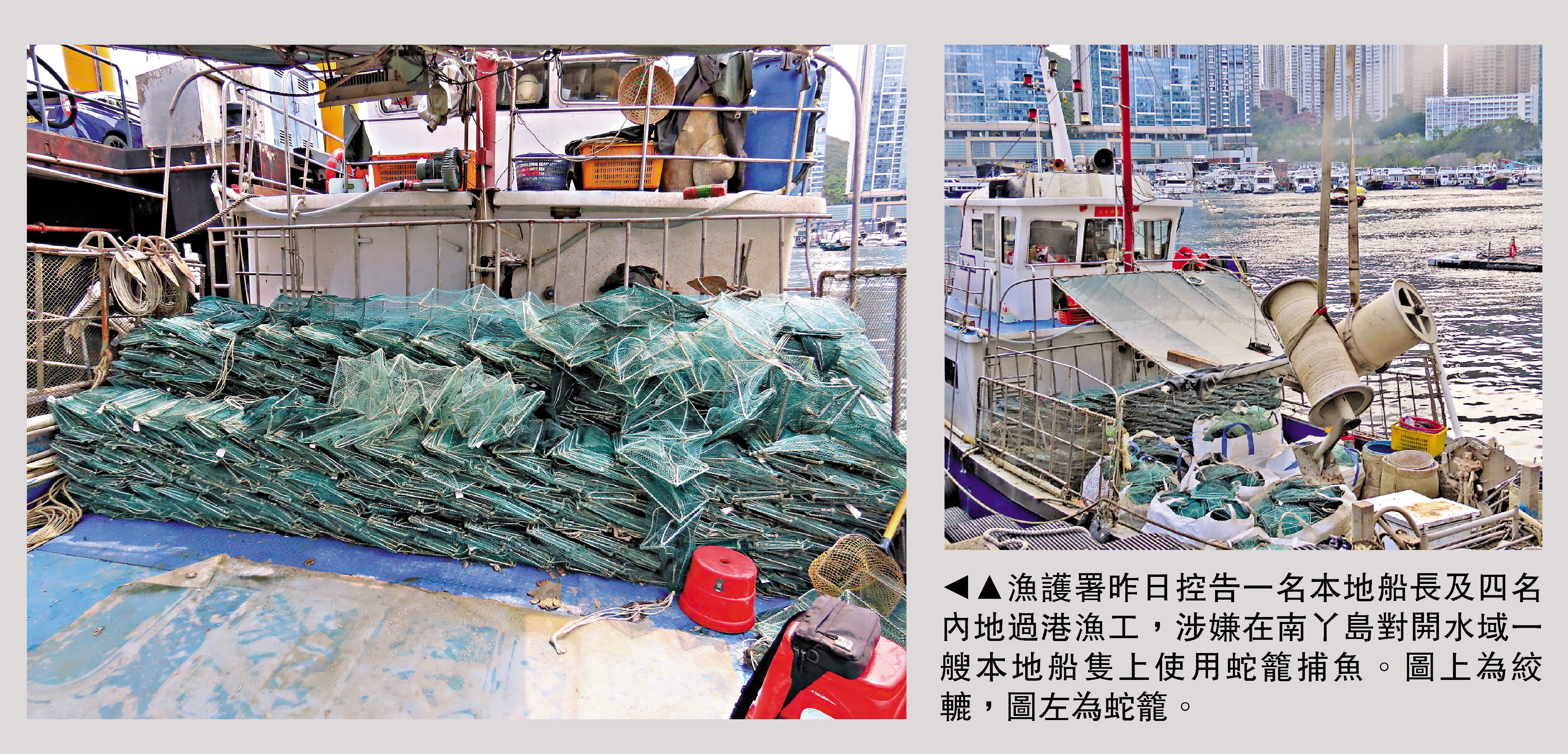 【大公報訊】記者鄭文迪報道:漁農自然護理署周三(4月15日)與警方聯合執法,在南丫島對開水域截停一艘涉嫌使用蛇籠捕魚的本地船隻調查,漁護署人員從船上檢取一批捕魚工具,包括蛇籠和絞轆。經調查後,一名本地船長及四名內地過港漁工涉嫌違反《漁業保護條例》,已被落案控告,案件將於今日在東區裁判法院提堂。