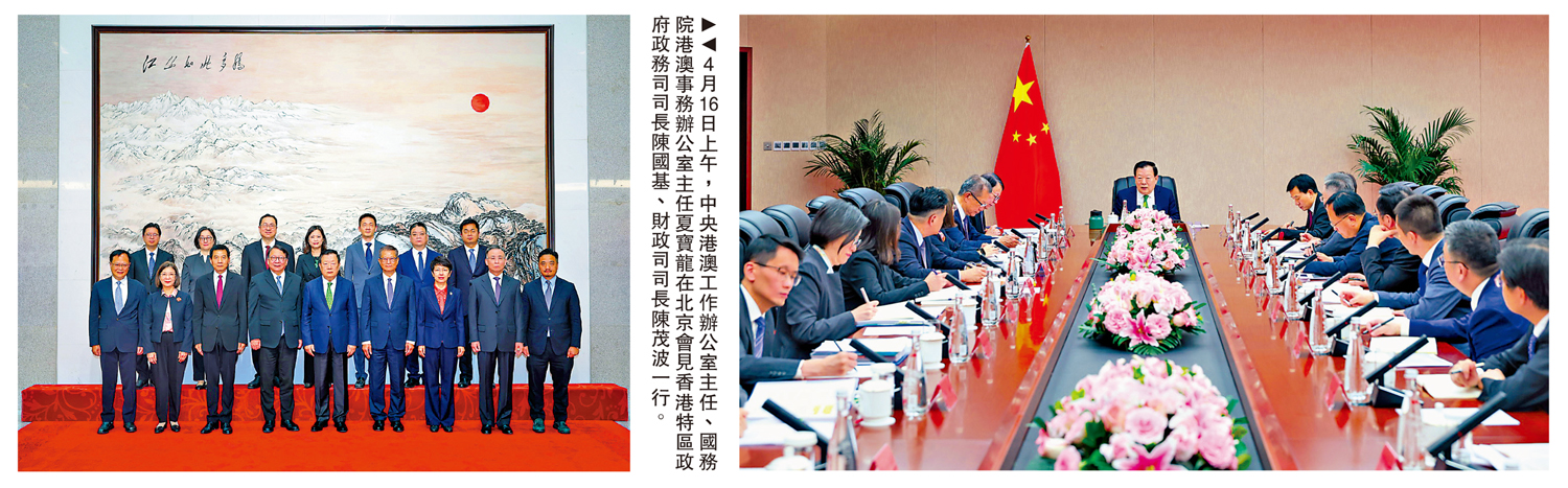 4月16日上午,中央港澳工作辦公室主任、國務院港澳事務辦公室主任夏寶龍在北京會見香港特區政府政務司司長陳國基、財政司司長陳茂波一行,就香港主動對接國家「十五五」規劃、融入和服務國家發展大局座談交流。