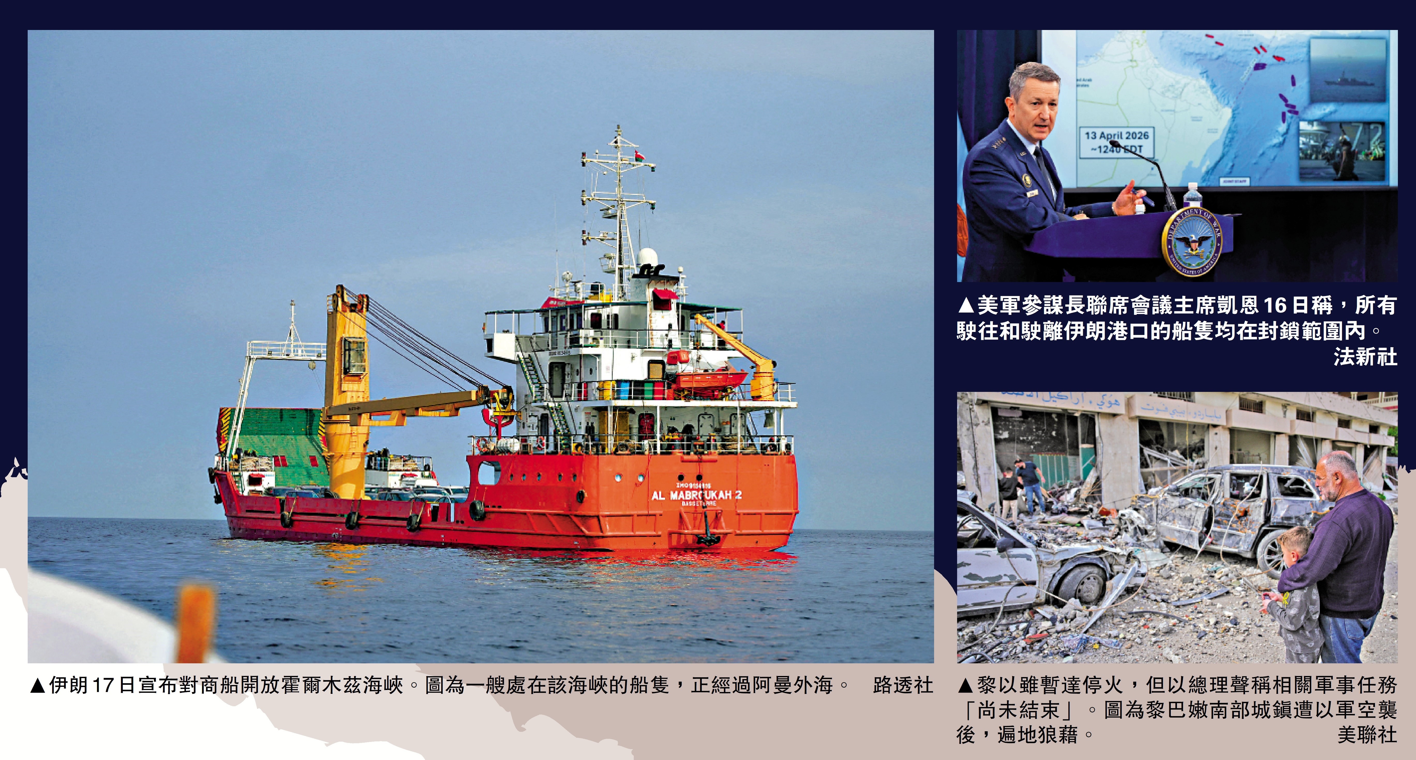 伊朗外長阿拉格齊17日表示,鑒於黎巴嫩和以色列達成停火,在停火期間,伊朗對所有商船開放霍爾木茲海峽。美國總統特朗普隨後予以確認,更稱「感謝」伊朗。但特朗普同時表示,美軍針對伊朗的海上封鎖將繼續有效。伊朗指出,如果美國繼續對伊朗進行海上封鎖,伊方將關閉霍爾木茲海峽。伊朗媒體報道霍爾木茲海峽開放通行的三大條件。受開放霍爾木茲海峽的消息影響,國際油價急跌13%,美股應聲上揚。另外,美媒援引消息人士稱,美伊新一輪談判有望於19日在巴基斯坦舉行。\大公報記者 陳明