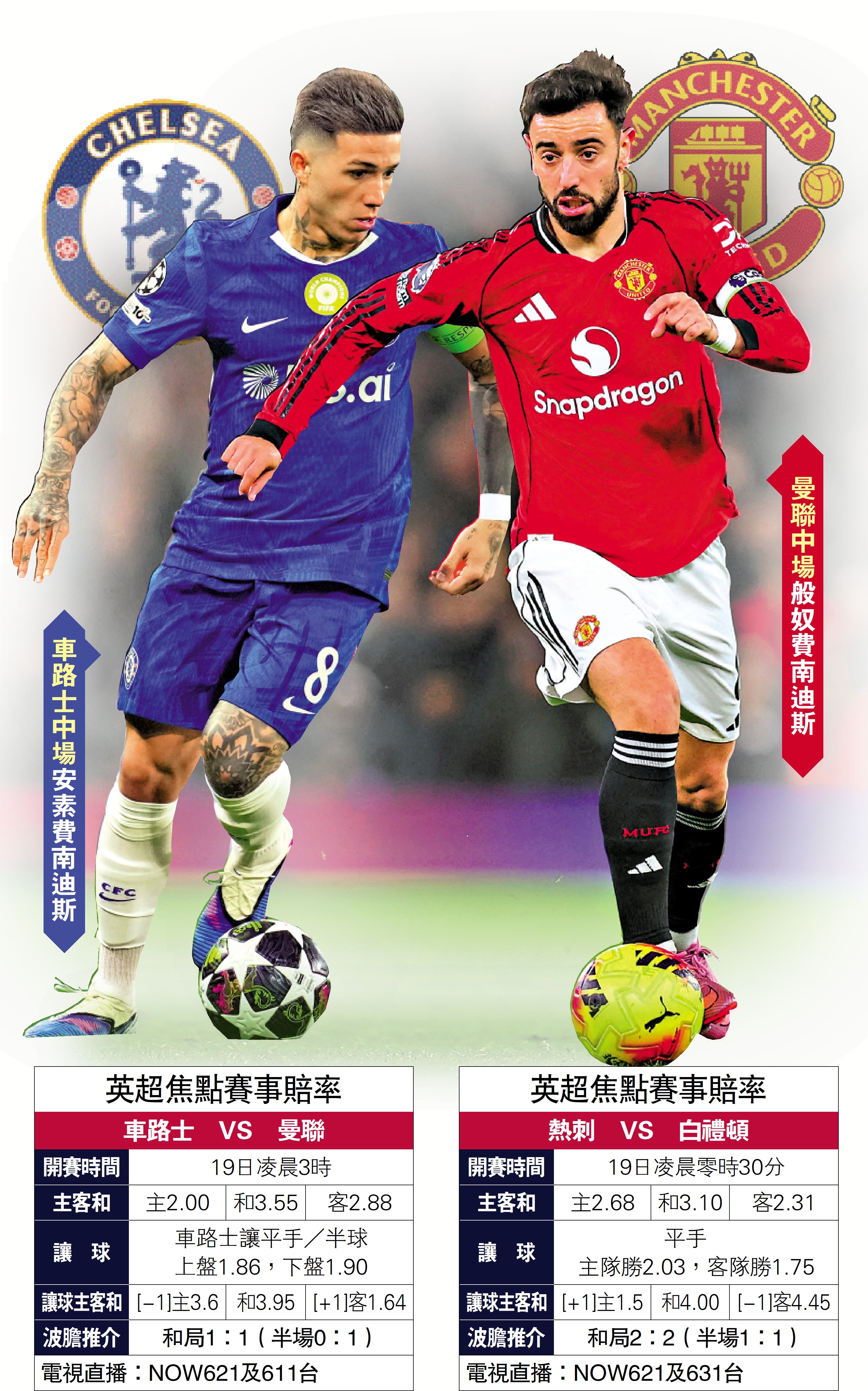 史丹福橋在香港時間19日凌晨將上演一場英超前5之爭的「Big 6」大戰,「藍戰士」車路士出兵主場迎擊「紅魔鬼」曼聯。兩隊近況都平平,車路士所有賽事近6場竟5度吃敗,而曼聯近4戰亦僅獲1勝,上仗在奧脫福不敵列斯聯,更是暫代主帥卡域克領軍以來首次主場落敗;車路士此役將有被主帥羅辛尼亞禁賽2場的中場安素費南迪斯重新候命,而曼聯中場靈魂般奴費南迪斯正朝打破英超單季助攻紀錄進發,兩位「費南迪斯隊長」,或主宰着今場「藍紅戰」勝負。\大公報記者 譚德龍