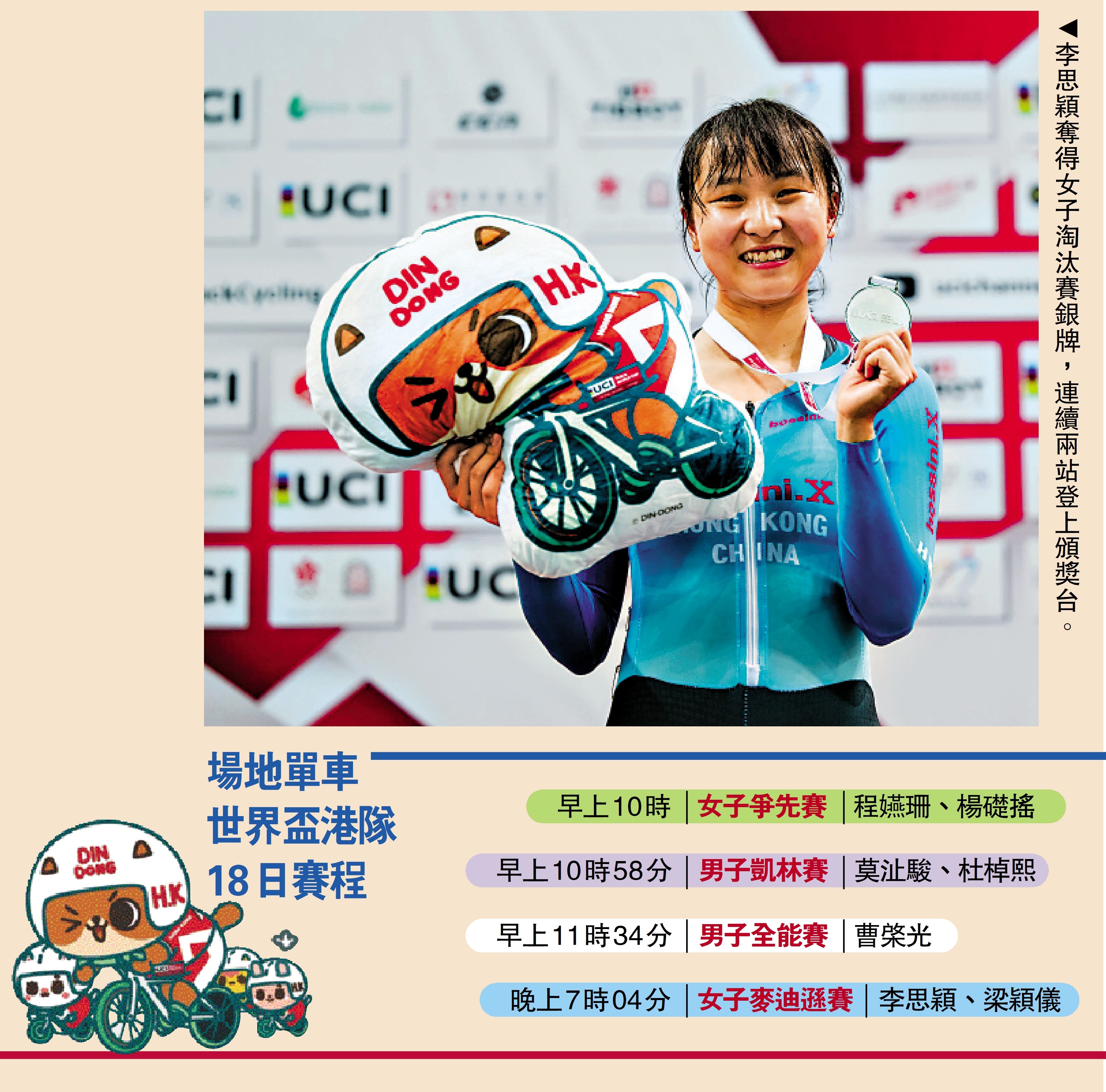18日進行的第2天賽事,李思穎將夥拍梁穎儀出戰女子麥迪遜賽,兩人在上月的珀斯站遺憾只得「梗頸四」而無緣獎牌,今次回到主場獲觀眾熱烈打氣之下,當然要力爭踏上頒獎台。