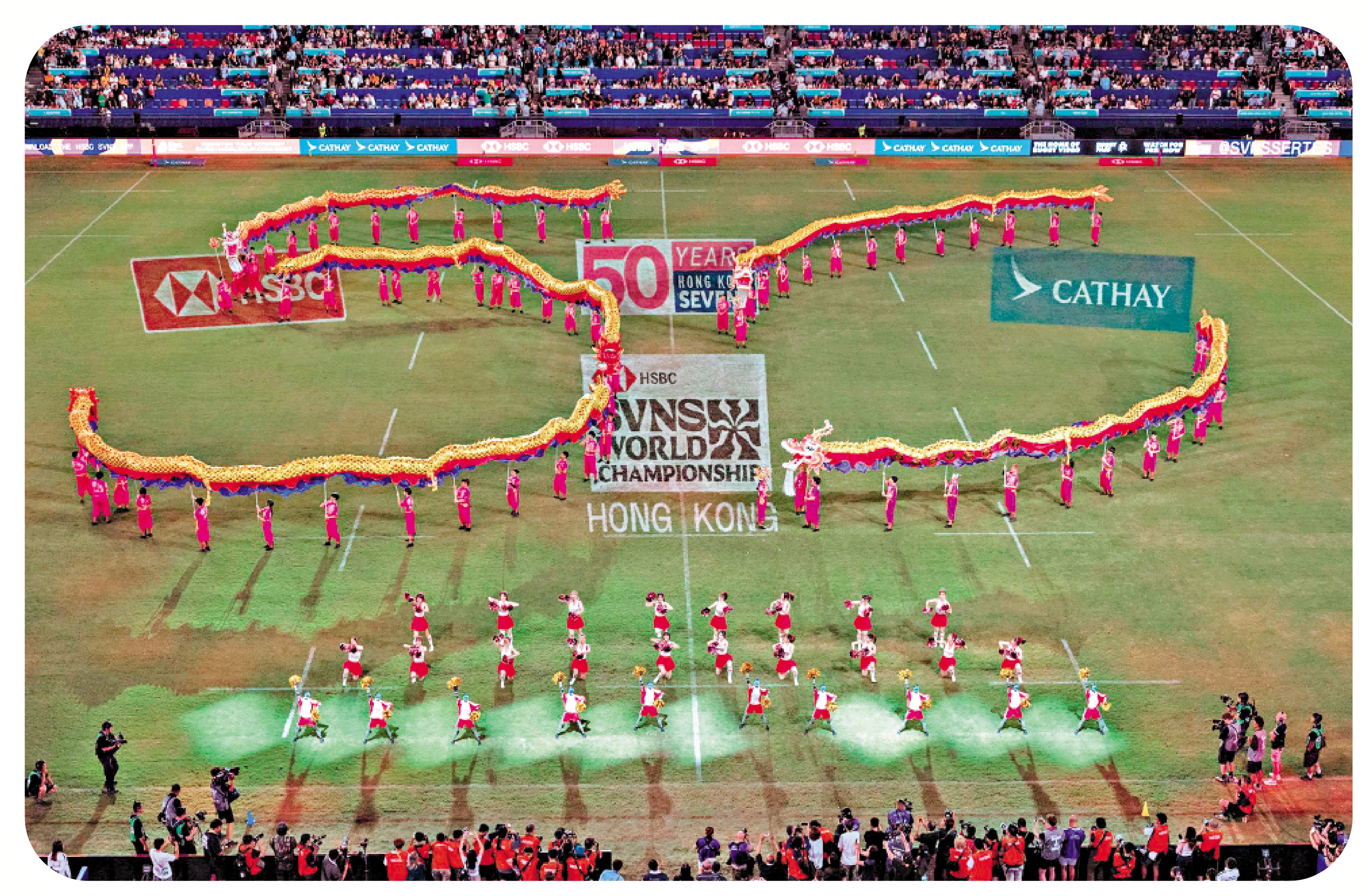 主場館大草坪配合舞動激光投影,呈現歷屆參賽國家、七欖傳奇球星名字及雙龍飛舞效果。