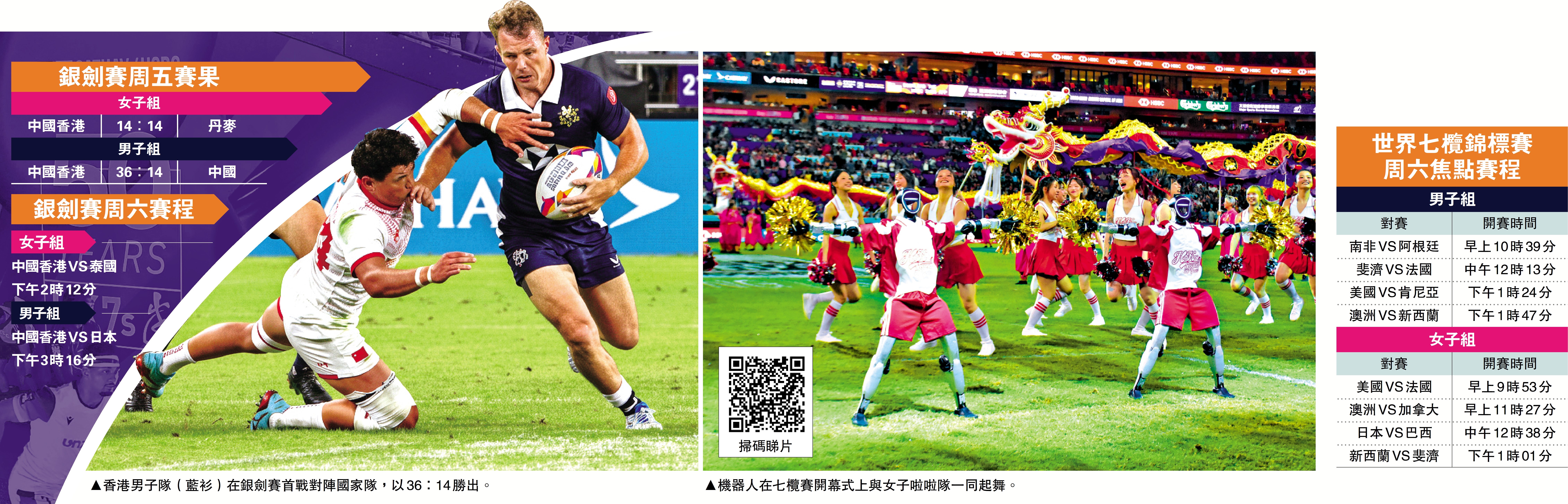 一連三天體壇盛事的「國泰/滙豐香港國際七人欖球賽」17日於啟德主場館揭幕,首天便有34368名觀眾入場觀賽,現場氣氛熱烈。今屆適逢賽事50周年,賽事合共30支強隊同場競技,展現世界頂級欖球水平。其中香港球迷最關注的「銀劍賽」,力爭三連冠的中國香港男子隊首戰面對中國國家隊,最終勝出36:14取得開門紅;女子港隊則憑莊嘉欣下半場兩度達陣,以14:14賽和丹麥隊。\大公報記者 張銳(文、圖)