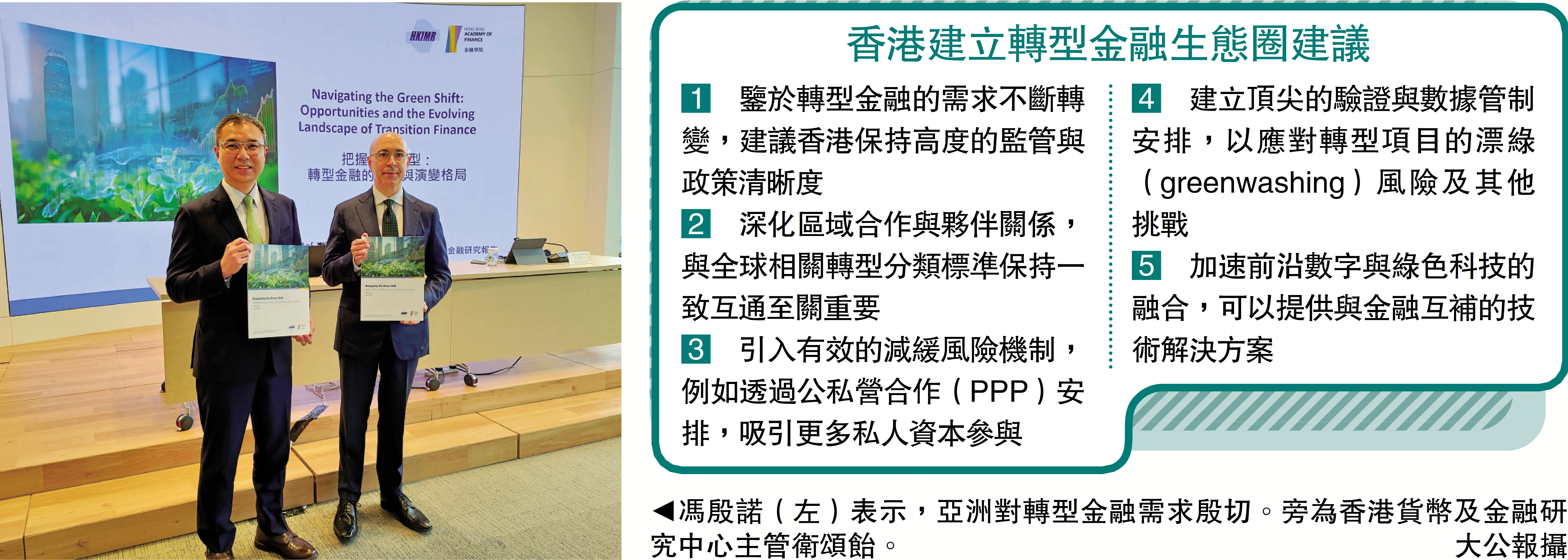報告提出五項發展建議:一是保持高度的監管與政策清晰度;二是深化區域合作,與全球分類標準保持一致;三是引入有效的減緩風險機制;四是建立頂尖的驗證與數據管制安排,應對漂綠風險;五是加速融合數碼技術與綠色科技,利用「綠色金融科技地圖」及大灣區綠色科技集群優勢。