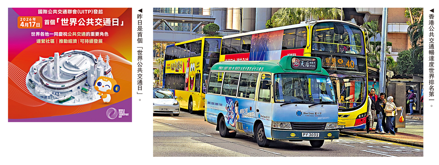 昨日是國際公共交通聯會推動的首個「世界公共交通日」,香港公共交通的暢達度一向獲譽為「世一」。運輸及物流局局長陳美寶昨日在社交平台表示,香港是千萬級別的公交城市,每日高達1200萬人次使用公共交通服務出行。特區政府致力完善公共交通服務,以公共交通為本的運輸政策,強化本地和跨境運輸基建,帶動經濟發展並優化乘客出行體驗。\大公報記者 易曉彤