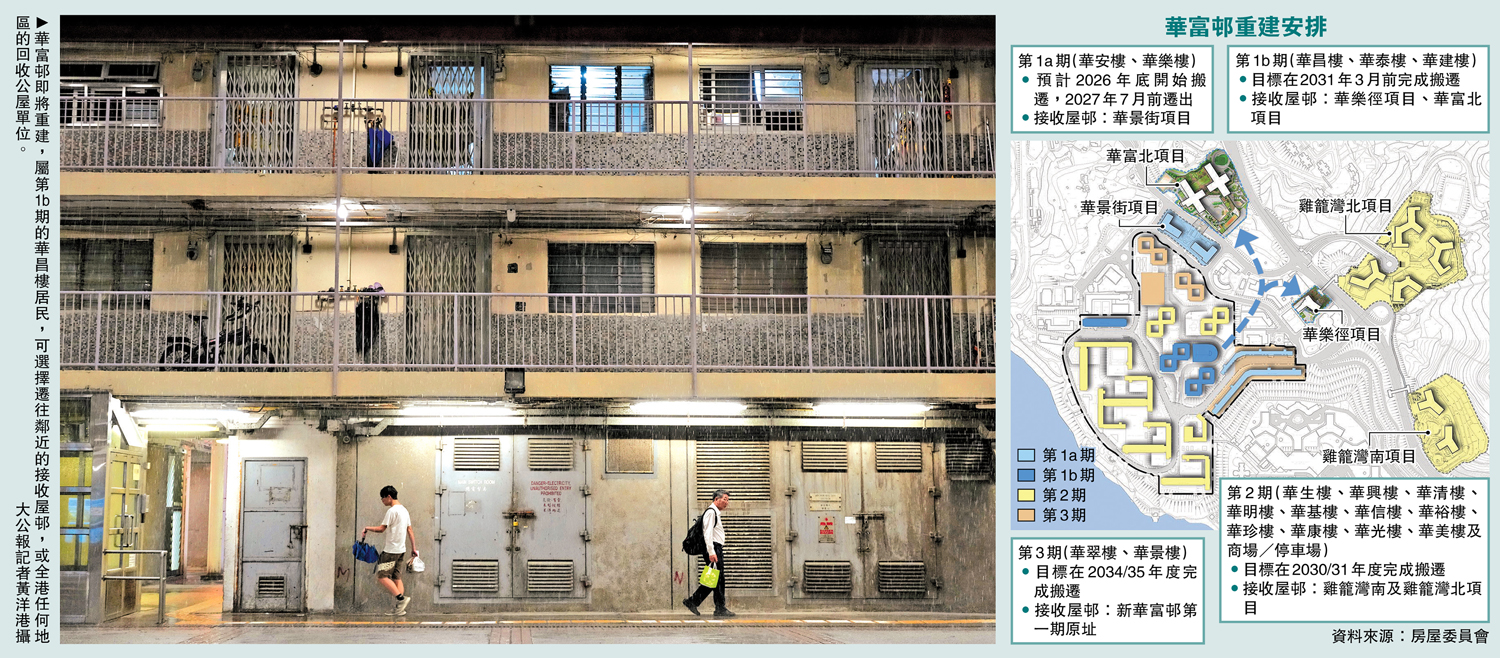 港島南區最老的公共屋邨、樓齡近60年的華富邨重建有新進展。房屋委員會昨日公布華富邨第1b期重建計劃清拆及遷置安排,涉及華昌樓、華泰樓和華建樓合共約1980戶,受影響居民最遲2031年3月前遷出,除了可選擇搬至鄰近的華樂徑及華富北接收屋邨,還可以遷往年底入伙的第1a期接收屋邨剩餘單位,更可在目標清空期前推出的資助出售單位計劃中獲安排優先選樓,包括今年推出的居屋或綠置居。