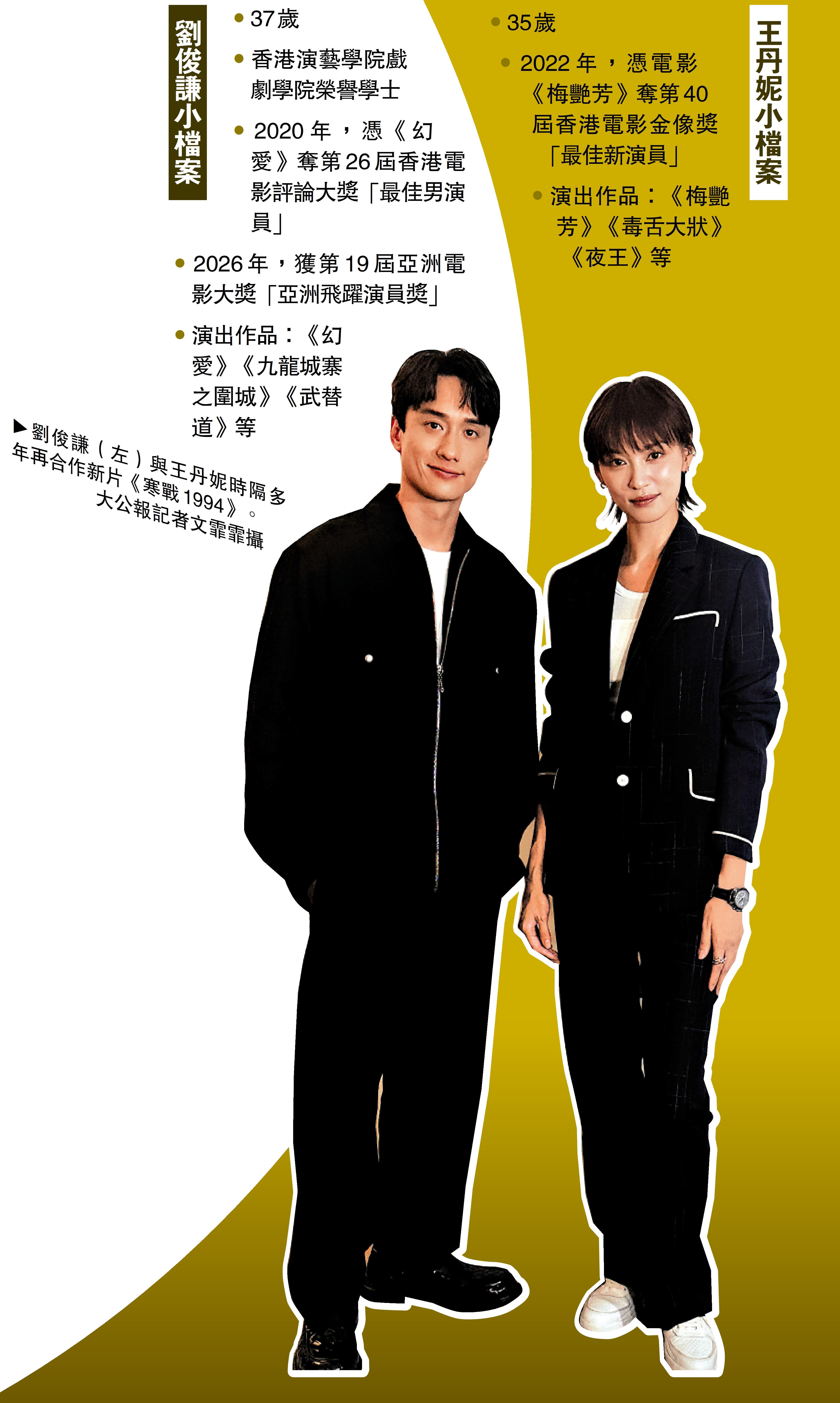 在即將上映的電影《寒戰1994》裏,劉俊謙將飾演年輕版李文彬;王丹妮則飾演新角色黑道龍頭「大家姐」。二人繼電影《梅艷芳》後相隔多年再度合作,今次的角色關係同樣千絲萬縷,再度合作不只是再次加入同一劇組,更像是彼此都在不同階段重新認識彼此,大家都成長、成熟了,但不變的是對演出仍保持執著。\大公報記者 文霏霏