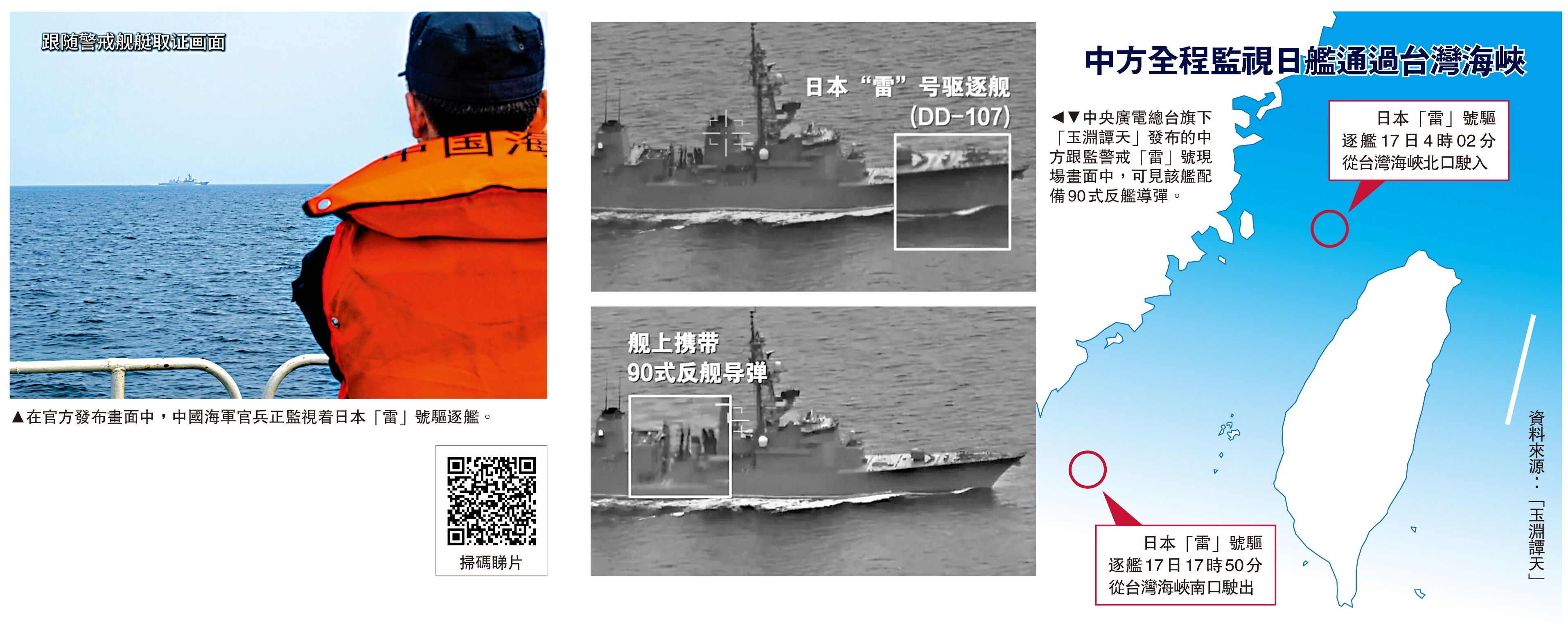 4月17日4時02分至17時50分,日本「雷」號驅逐艦過航台灣海峽,中國人民解放軍東部戰區組織海空兵力全程跟監警戒,實施有效規制管控。18日,中國人民解放軍新聞傳播中心官方微博「中國軍號」公布跟監警戒現場畫面,包括由無人機拍攝的現場視頻,呼應國防部發言人17日回應中強調中方「有效瞰制管控」。
