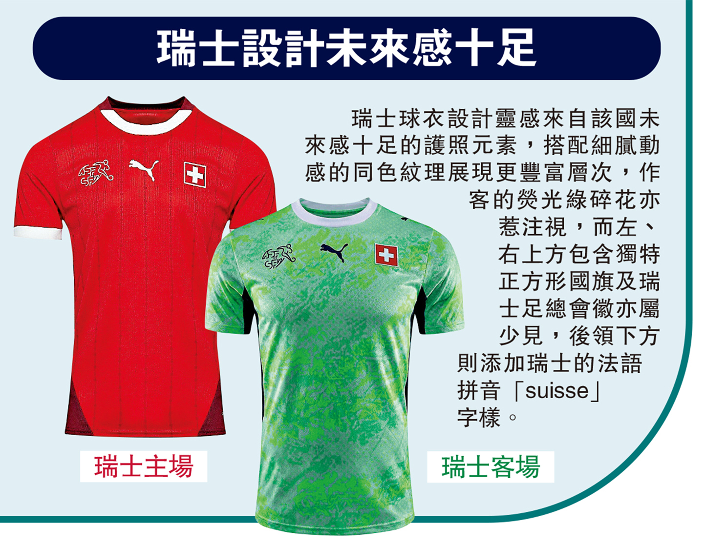 瑞士球衣設計靈感來自該國未來感十足的護照元素,搭配細膩動感的同色紋理展現更豐富層次,作客的熒光綠碎花亦惹注視,而左、右上方包含獨特正方形國旗及瑞士足總會徽亦屬少見,後領下方則添加瑞士的法語拼音「suisse」字樣。