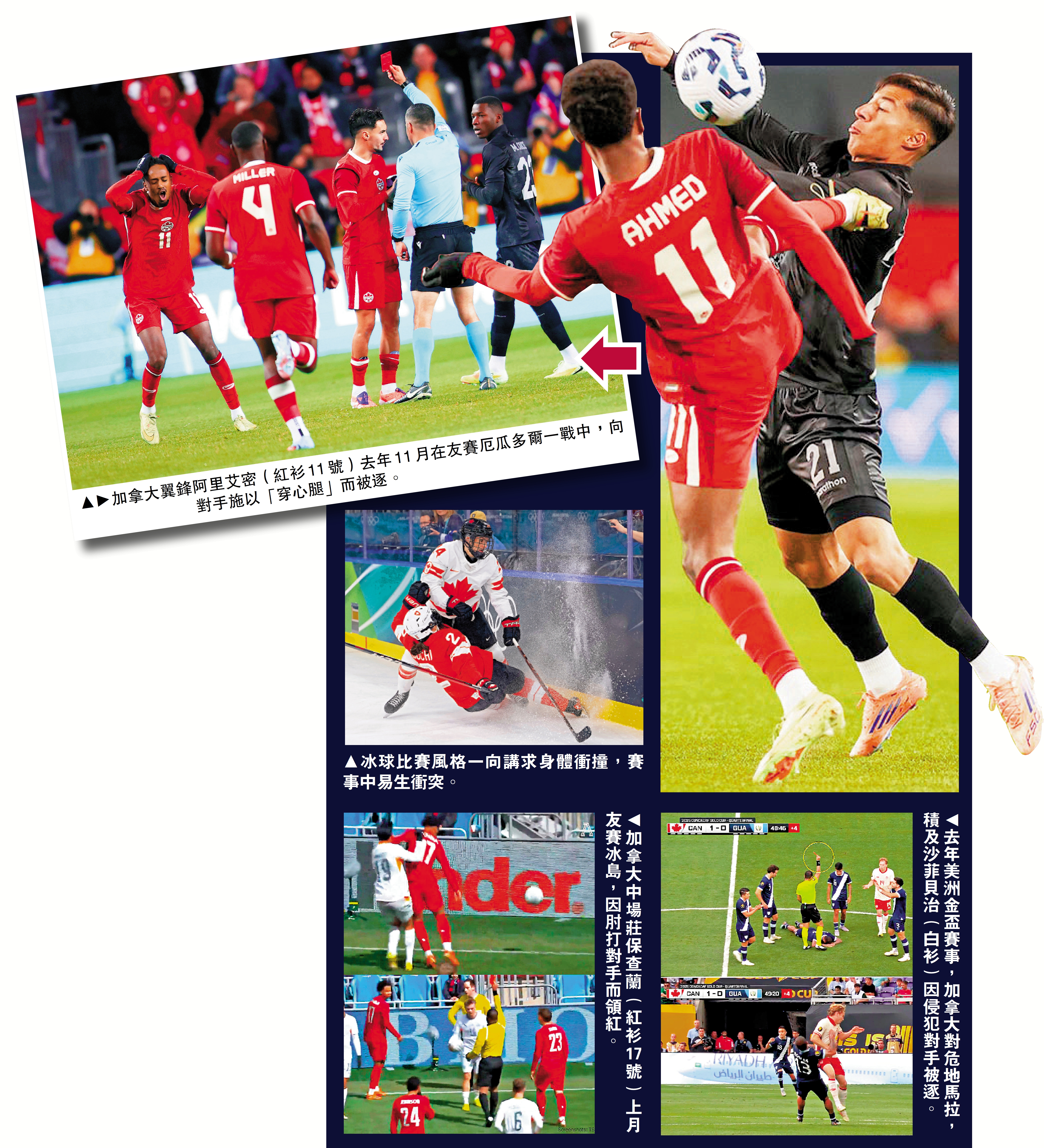對比墨西哥與美國,今屆另一東道主加拿大屬首次主辦世界盃決賽周,該隊身處B組對手有瑞士、波斯尼亞和卡塔爾。加拿大近大半年內的比賽,屢次有球員因為過激犯規而領紅牌被逐,就連主帥亦因過激向球證抗議而被罰離場。換個角度,冰球是「楓葉國」加拿大的國技,而這項運動其中一個標誌性場面就是雙方球員的激烈身體衝撞,甚至因而大打出手,足球隊的戰術也可能融入了冰球風格?\大公報記者 譚德龍