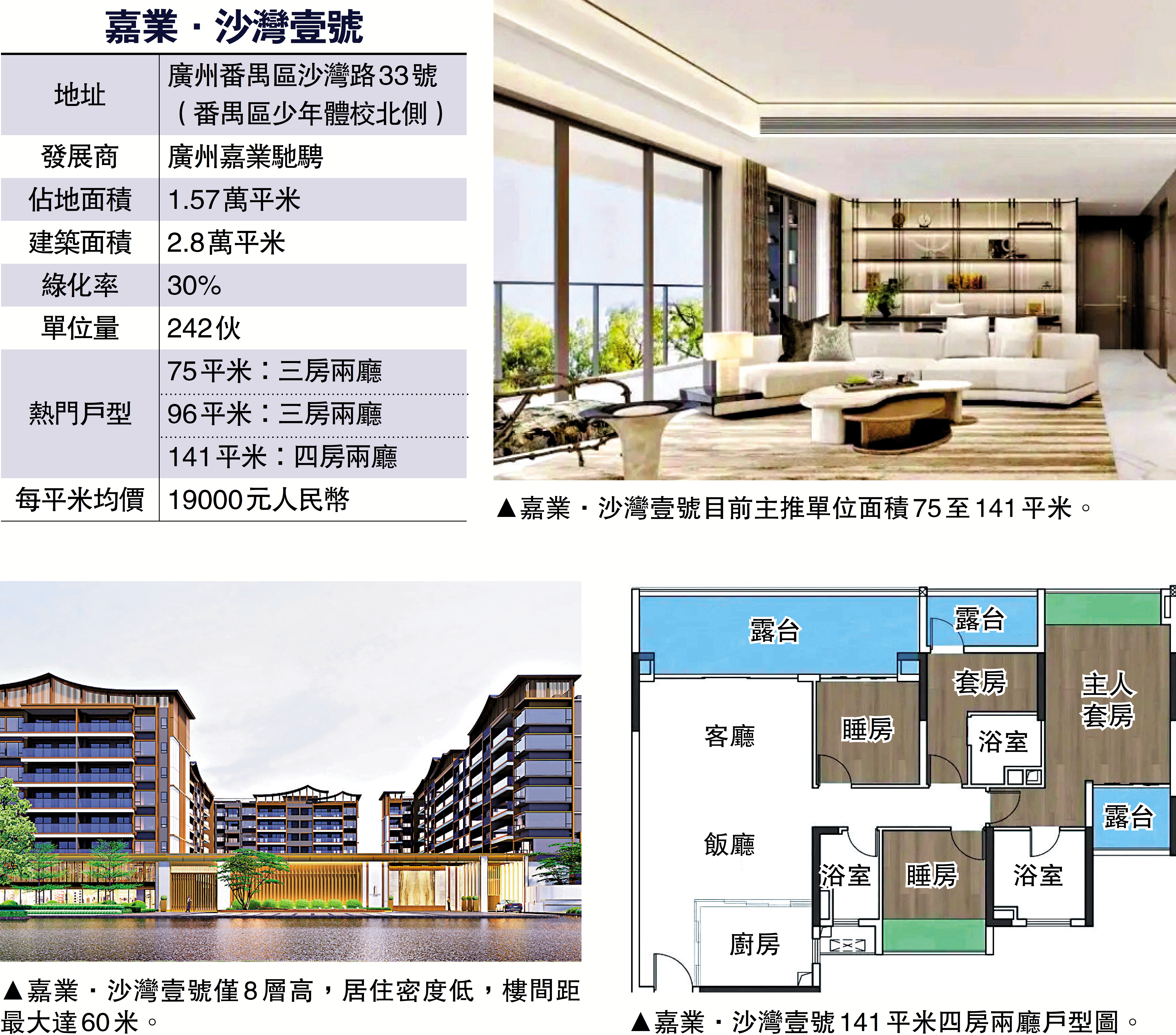 嘉業·沙灣壹號坐落廣州CBD城市中軸南端,位處番禺四大商圈交匯點、市橋生態居住區。項目由12幢8層高住宅組成,僅設242伙,超低密度設計,地積比率僅1.8倍,樓間距最大達60米,採光通透。