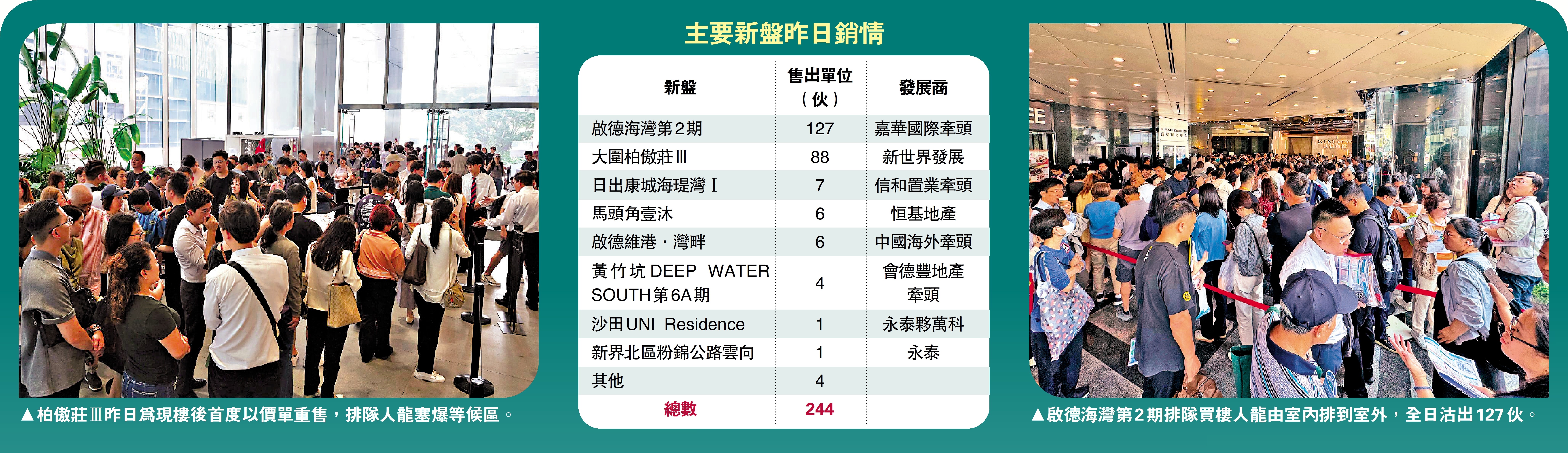 另一邊廂,嘉華國際(00173)牽頭發展的啟德跑道區啟德海灣第2期,首輪以價單推售160伙,雖較第1期賣貴20%,仍有大批捧場客,全日沽出127伙,發展商即日加推118伙,折實平均呎價21932元。在兩盤帶動下,昨日一手共錄逾240宗成交,是上月14日錄逾360宗後一個月來最旺的周六。\大公報記者 梁穎賢