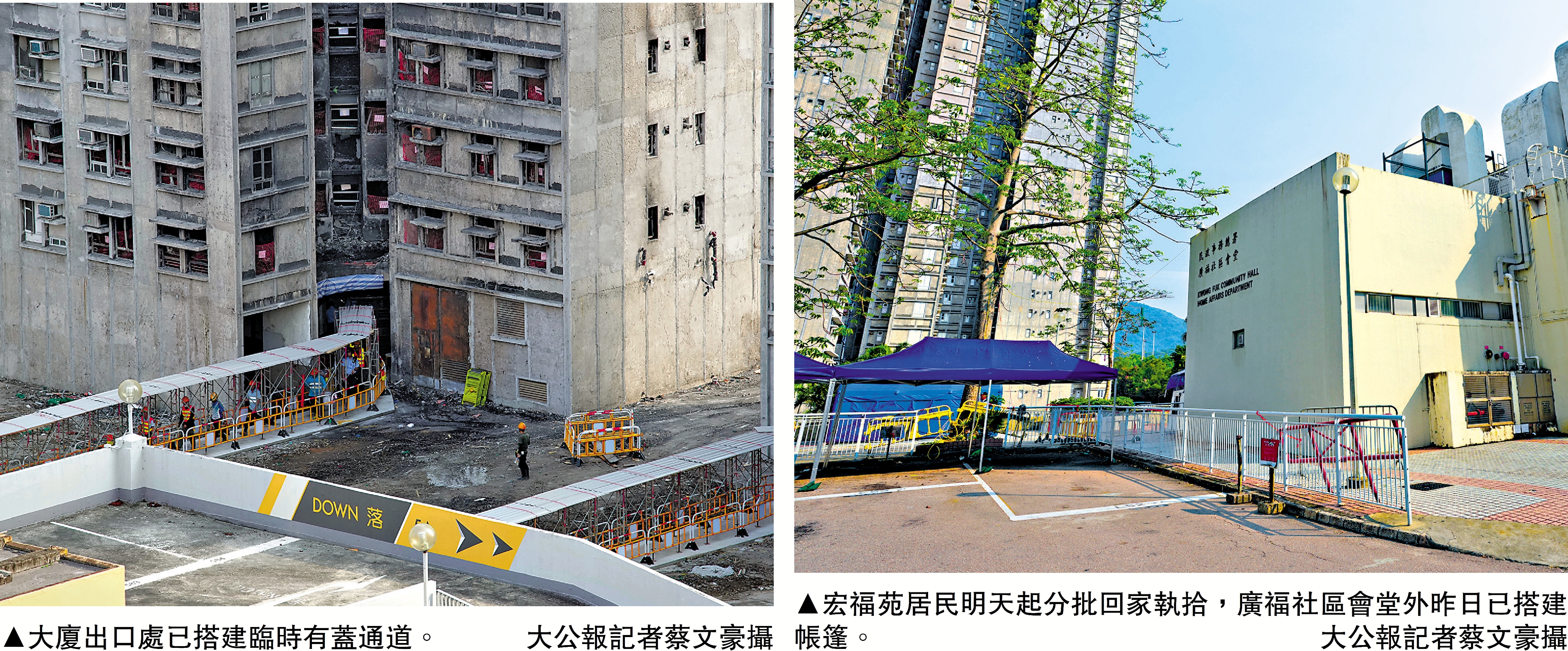 政府早前表示,屋苑環境仍惡劣,會搭建有蓋的安全通道讓居民進出。記者昨日見到,多座大廈的樓梯出口處已搭建有蓋通道,屋苑內不時有工人走動,似乎在為明天開始的居民上樓執拾安排做好準備。
