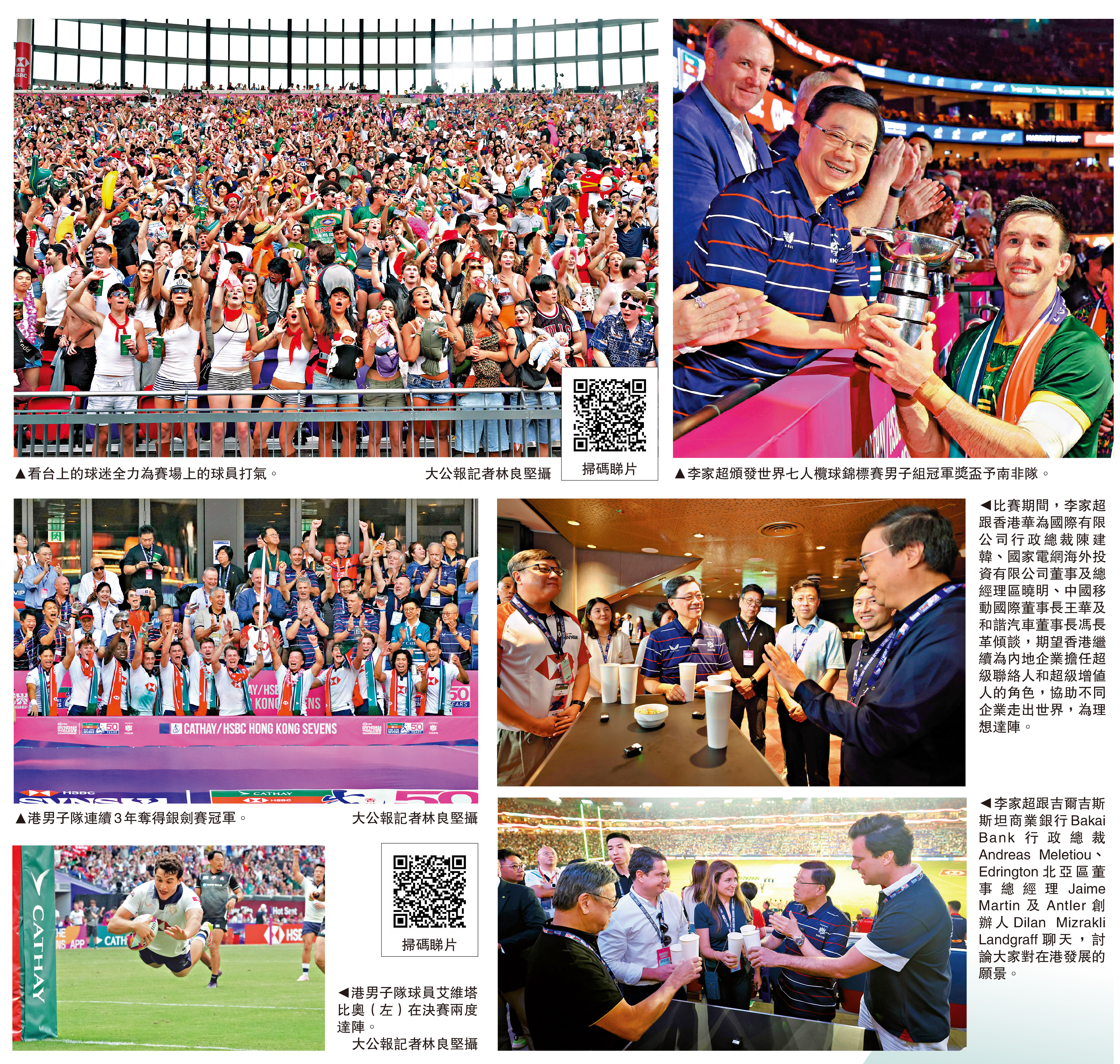 李家超並表示,在七欖比賽期間,與不同內地和外國企業代表聊天,他們都對香港的七人欖球賽讚不絕口,亦對香港未來的發展充滿信心。香港作為世界各地企業的「超級增值人」,正好發揮國際大都會的重要橋樑角色,協助不同企業以毅力和拚勁為夢想達陣,走向國際。