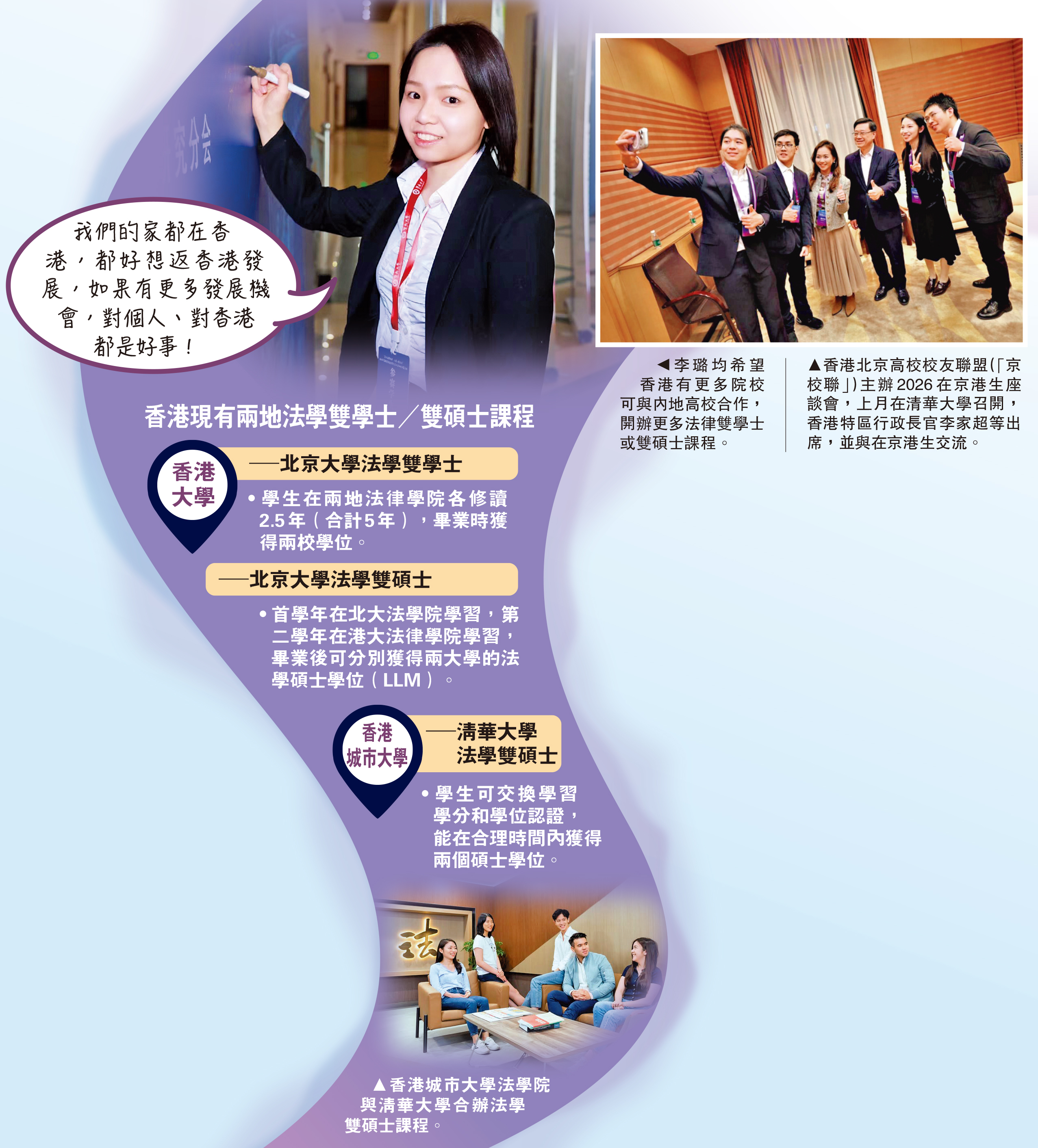 她表示,近年有香港與內地院校合辦雙學士學位及雙碩士課程,這對希望回港從事法律職業的同學有幫助,但目前開辦的學額及院校不多。她期望,未來兩地有更多的大學開辦更多類似課程,加強對「兩地通」法律專業人才的培育,「我們的家都在香港,都好想返香港發展,如果有更多發展機會,對個人、對香港都是好事!」