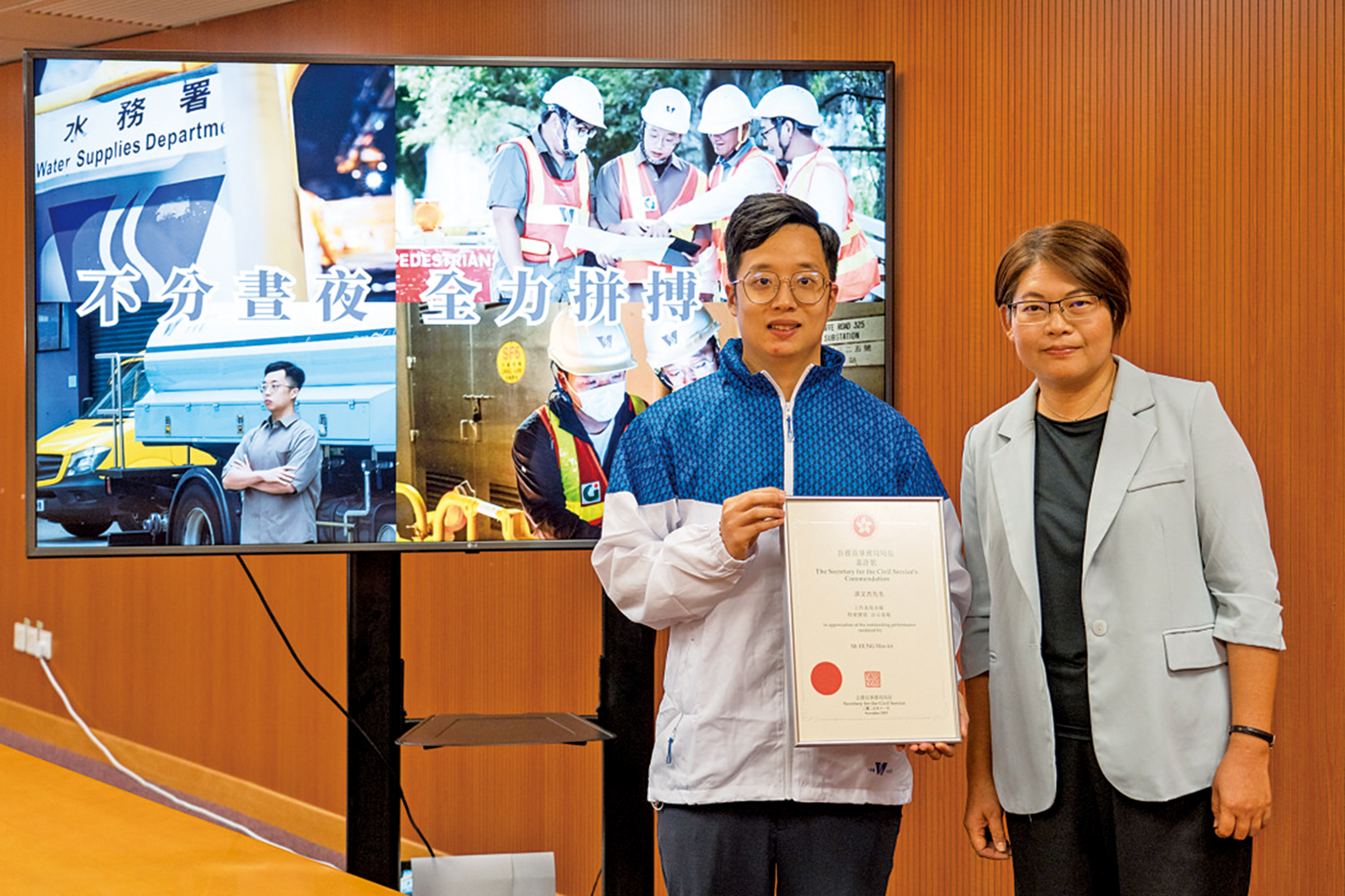 2025年共有100名公務員獲得公務員事務局局長嘉許狀,現年30歲的水務署一級監工洪文杰,為今屆最年輕得獎者。他透過水務署首屆學徒計劃,憑着堅毅與努力,逐步晉升,更帶領團隊高效處理水管滲漏事故,保障市民用水安全。