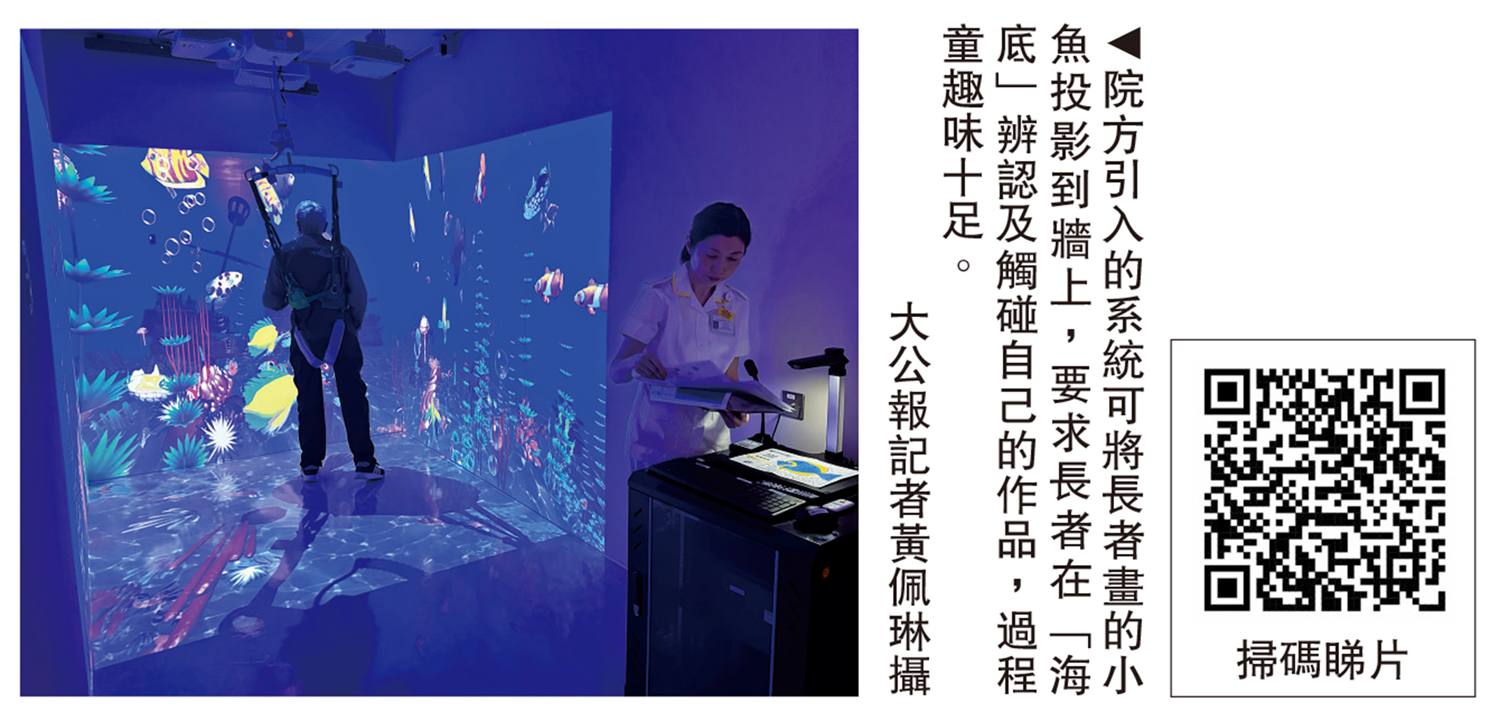 院方還新設「VR房」,VR投影可模擬地鐵站、超市等場景,讓長者練習居家和環境適應能力。系統還可將長者畫的小魚投影到牆面上,要求長者在「海底」辨認及觸碰自己的作品,以鍛煉手眼協調能力,過程的童趣味十足。東區醫院資深物理治療師李凱平表示,長者可和家人一起體驗VR互動,在互動中喚起兒時回憶,增進家人感情。