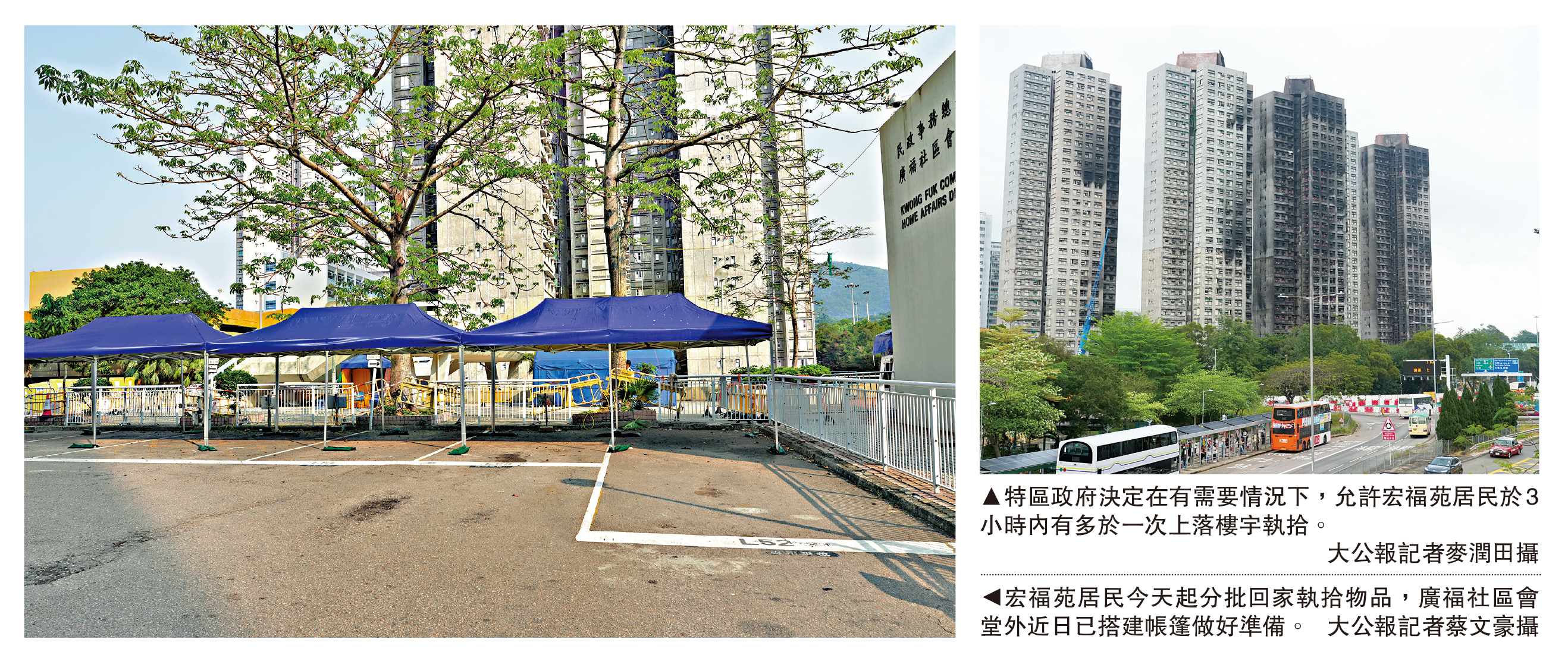 宏福苑大火發生至今約五個月,今日起至5月4日,除宏志閣外,其餘七座大廈的居民可陸續上樓執拾。宏新閣是首幢開放讓居民上樓的大廈,今日起一連三日,每日分別開放10至11層的單位讓居民回家執拾。