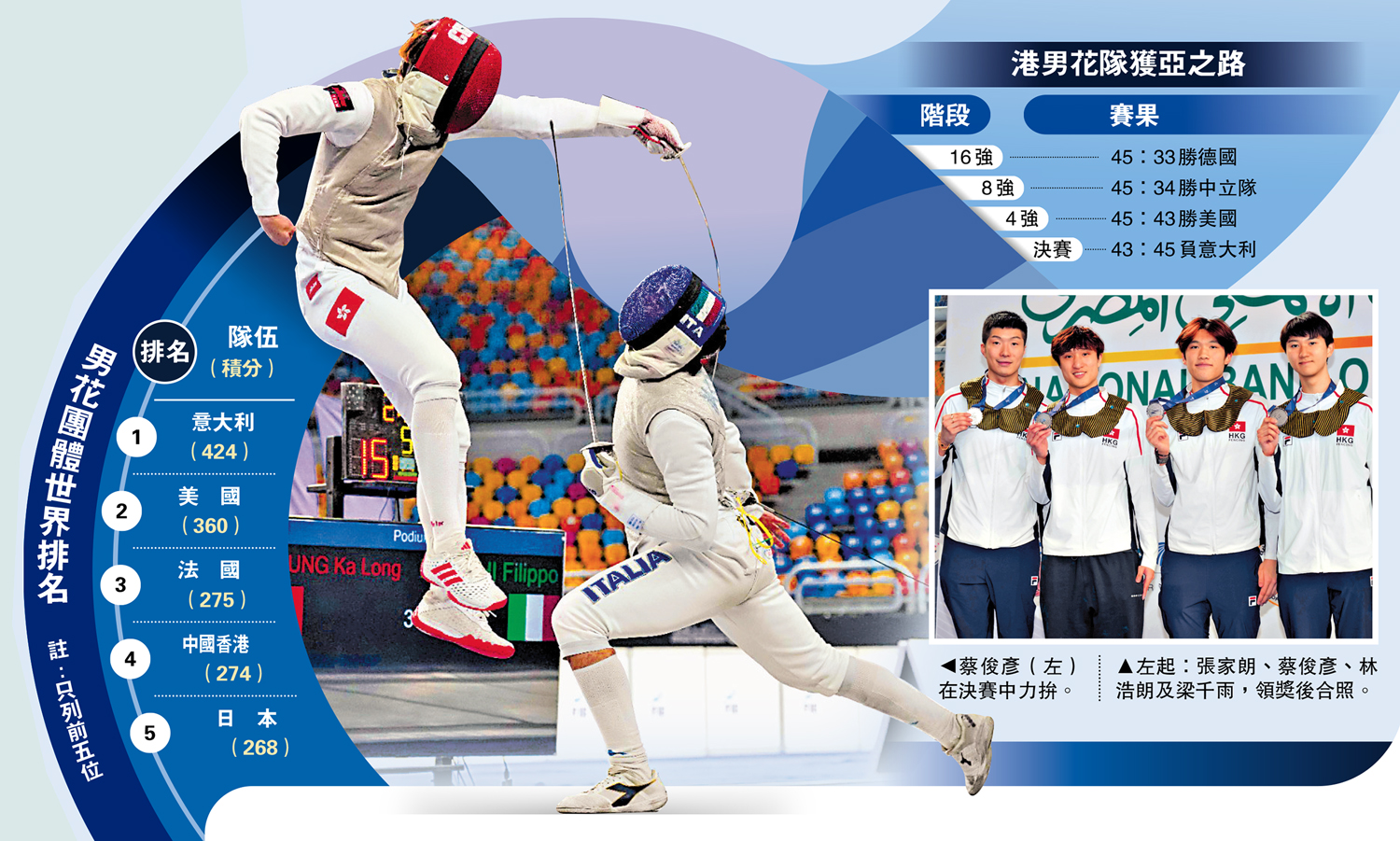 由張家朗、蔡俊彥、梁千雨及林浩朗組成的中國香港男子花劍隊,19日出戰花劍世界盃開羅站團體賽事。港隊從16強起接連擊敗德國隊等勁旅而晉級決賽。決賽對陣世界排名第1位的意大利隊,狀態大勇的港隊曾一度領先,但最終以43:45惜敗該支巴黎奧運會銀牌隊伍,收穫銀牌,繼在今年1月巴黎站奪冠後,連續兩站取得獎牌。國際劍聯20日公布最新的世界排名,港隊升上第4位,成為「亞洲一哥」。\大公報記者 梁潤森