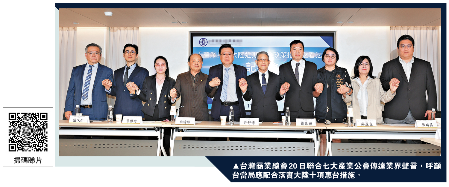 大陸日前發布十項惠台政策引發台灣社會各界熱議,但民進黨當局仍「膝跳反應」抹黑、刻意延宕應對惠台措施。台灣商業總會20日聯合七大產業公會傳達業界聲音,疾呼台當局應加速溝通,以人民為念不要囿於意識形態阻擋兩岸產業開放。