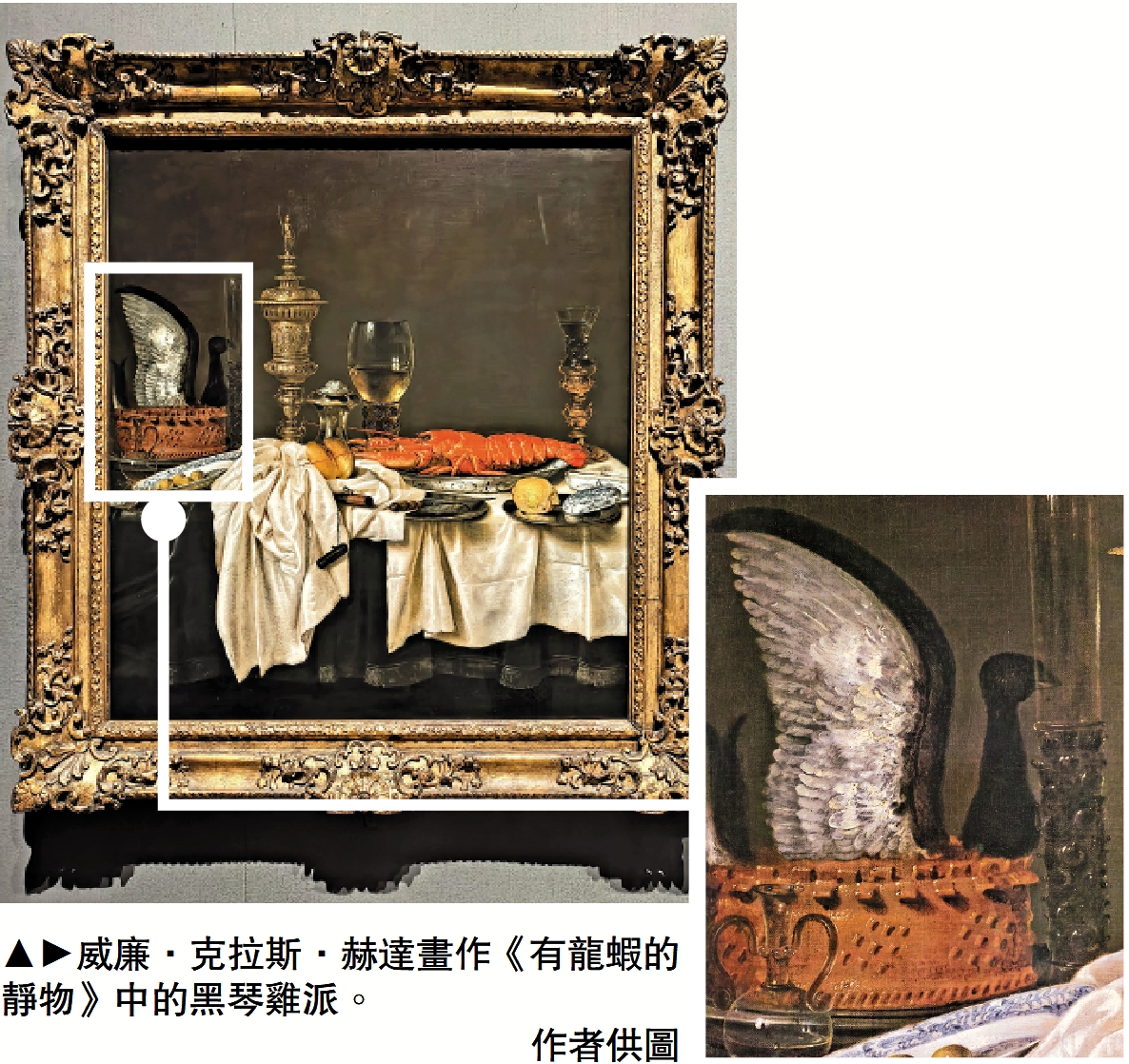 在狩獵靜物題材畫作中,稀有的黑琴雞(荷蘭語Korhoen,學名Lyrurus tetrix)在畫中多以戰利品的形式出鏡。然而,被烹飪之後擺在宴會桌上作為盛大展示菜的「黑琴雞派」卻極少入畫。在那個餐桌上沒有「手機先吃」條件的時代,該如何把自己享用過的美食炫耀給座上賓呢?對於那些家世顯赫且有炫富需求的貴族而言,一個靜物畫的細分畫種「華麗靜物」(Pronkstilleven)應運而生。而赫達的這幅《有龍蝦的靜物》中餐桌上擺放的所有物品,包括盛放龍蝦、橄欖的藍白相間瓷盤是進口自我國的明青花瓷、橄欖和檸檬是地中海的舶來品、畫中最亮眼且佔據作品「C位」的大龍蝦,以及桌上形制各異的玻璃杯和銀器,均是「華麗靜物」的「標配」。而玻璃器皿上的各種光影折射、桌布上的絲綢光澤質感,以及瓷器和陶器上溫潤的釉面反光,將赫達所引以為豪的、精確描摹事物材質的高超畫技展現得淋漓盡致。相比之下,畫中最左側的暗色背景中由精美陶盤盛放的一道烘烤完畢的黑琴雞派則顯得低調內斂很多,但事實上,這道菜的「隱藏屬性」同樣完美契合「華麗靜物」的內核。