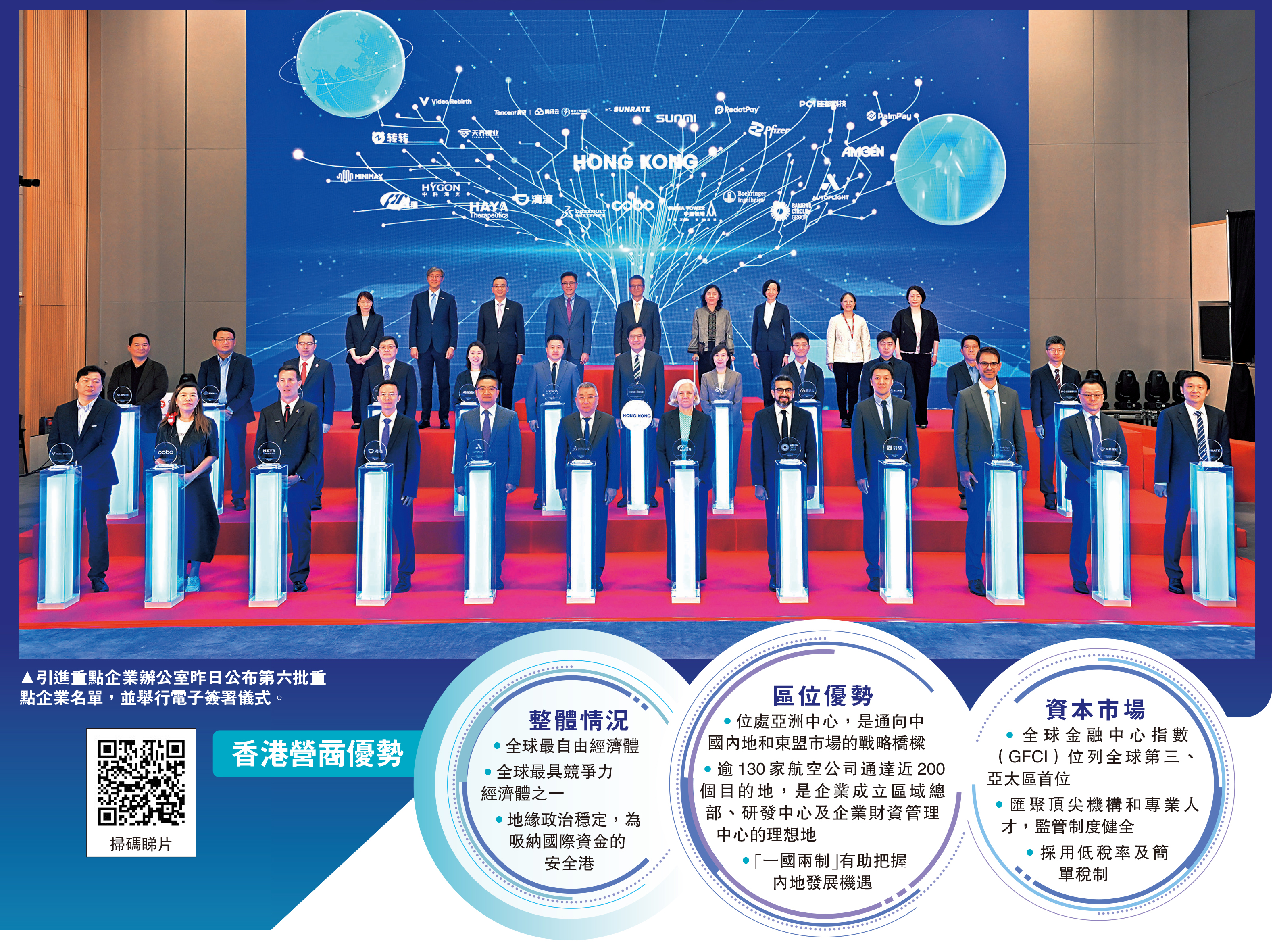 陳茂波強調,重點企業的落戶是雙贏局面。一方面,這些企業為香港帶來投資,創造就業,亦帶來惠及社會的創新應用;另一方面,香港為這些企業提供走向全球所需的平台和聯繫,包括優質的金融和專業服務,以及人才的支援等。