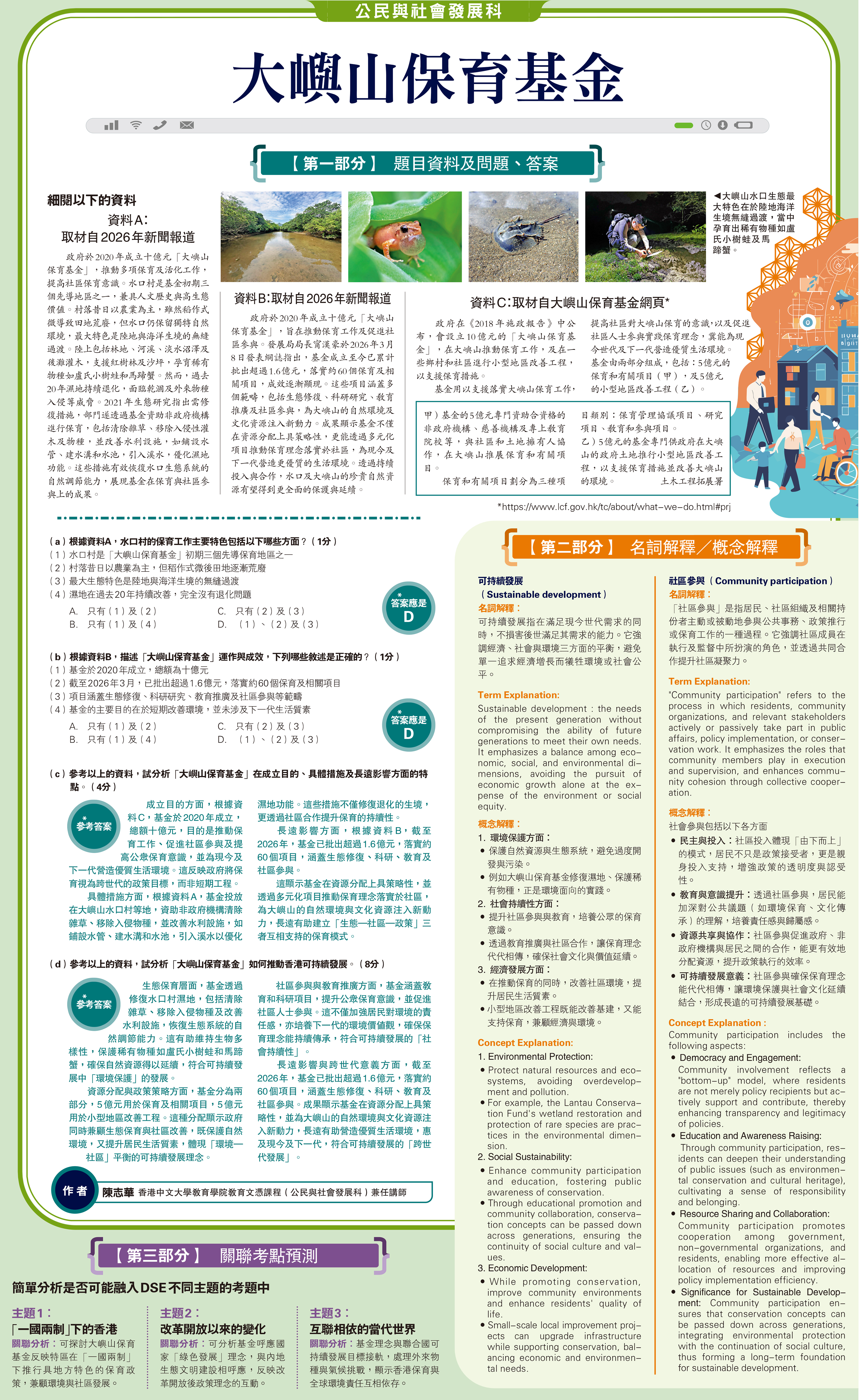 關聯分析:可探討大嶼山保育基金反映特區在「一國兩制」下推行具地方特色的保育政策,兼顧環境與社區發展。