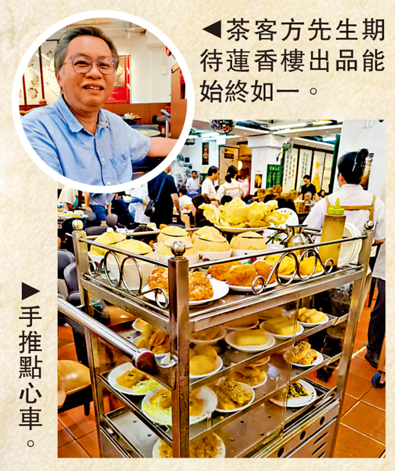 今次聽聞蓮香樓搬遷的消息,他特意上樓「懷舊」一下,開心見到一些傳統的茶樓元素都還在,不禁憶述起以前在蓮香樓飲茶的時光。