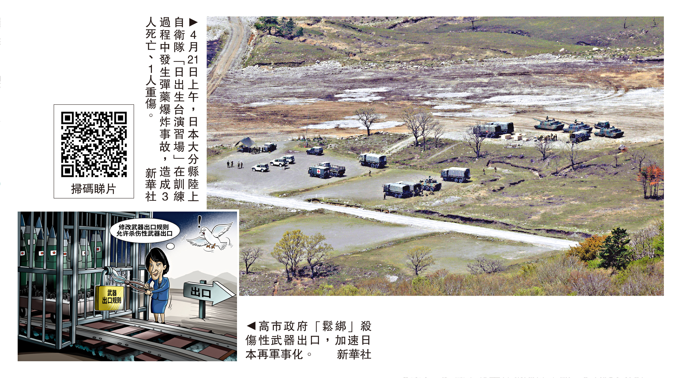 【大公報訊】綜合新華社、北京青年報報道:規則修改後,日本取消了此前將武器出口限定在5類非戰鬥用途範圍內的限制,原則上允許包括殺傷性武器在內的成品武器出口;在特定情況下,也將允許向處於衝突中的國家出口武器。根據新規則,日本武器出口將由首相、內閣官房長官、外務大臣和防衛大臣審批,獲批後再通報國會。