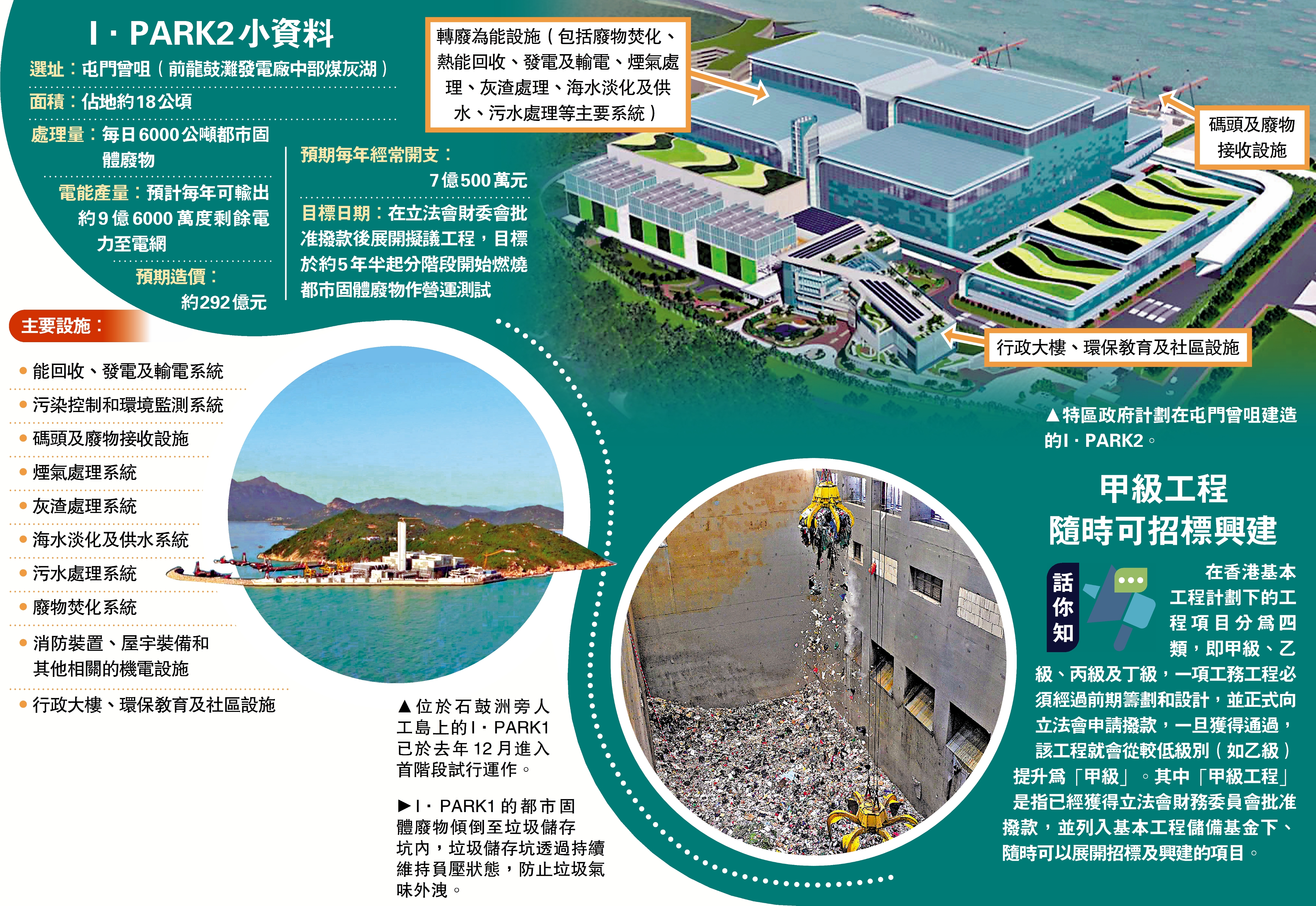 為確保在2035年達至「零廢堆填」,特區政府正在推進發展以焚化為核心技術的綜合廢物管理設施,繼位於石鼓洲旁人工島上的I·PARK1,政府計劃在屯門曾咀建造I·PARK2。環境及生態局昨日向立法會提交文件建議,將I·PARK2提升為甲級工程,預計造價292億元,較原先初步估算金額大幅減少18%,目標於五年半後作營運測試。