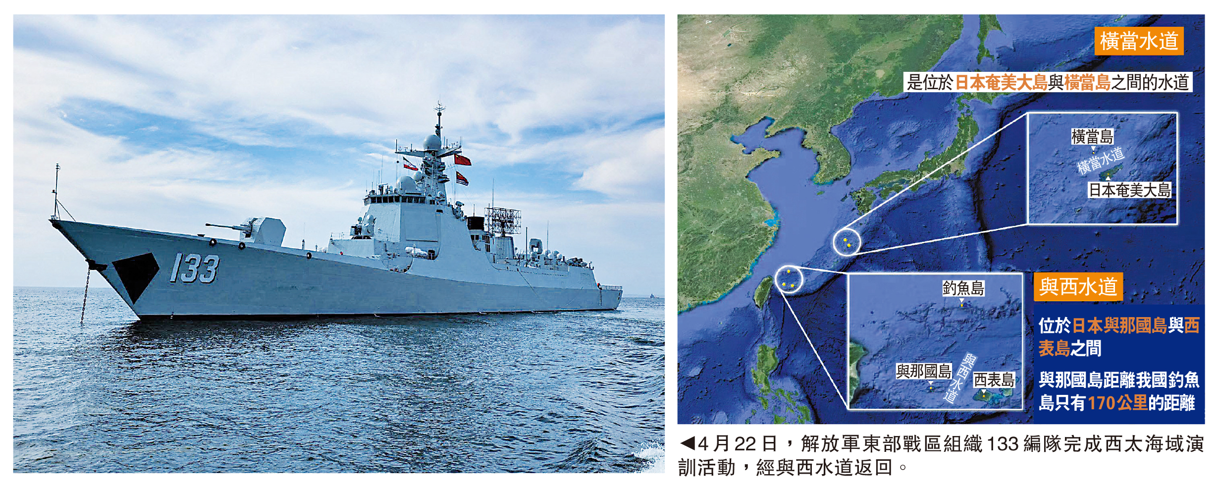 4月19日,133號艦艇編隊過航橫當水道赴西太開展演訓活動。4月22日,133編隊完成西太海域演訓活動,經與西水道返回。與西水道位於與那國島與西表島之間,其中,與那國島距離我國釣魚島只有170公里的距離。