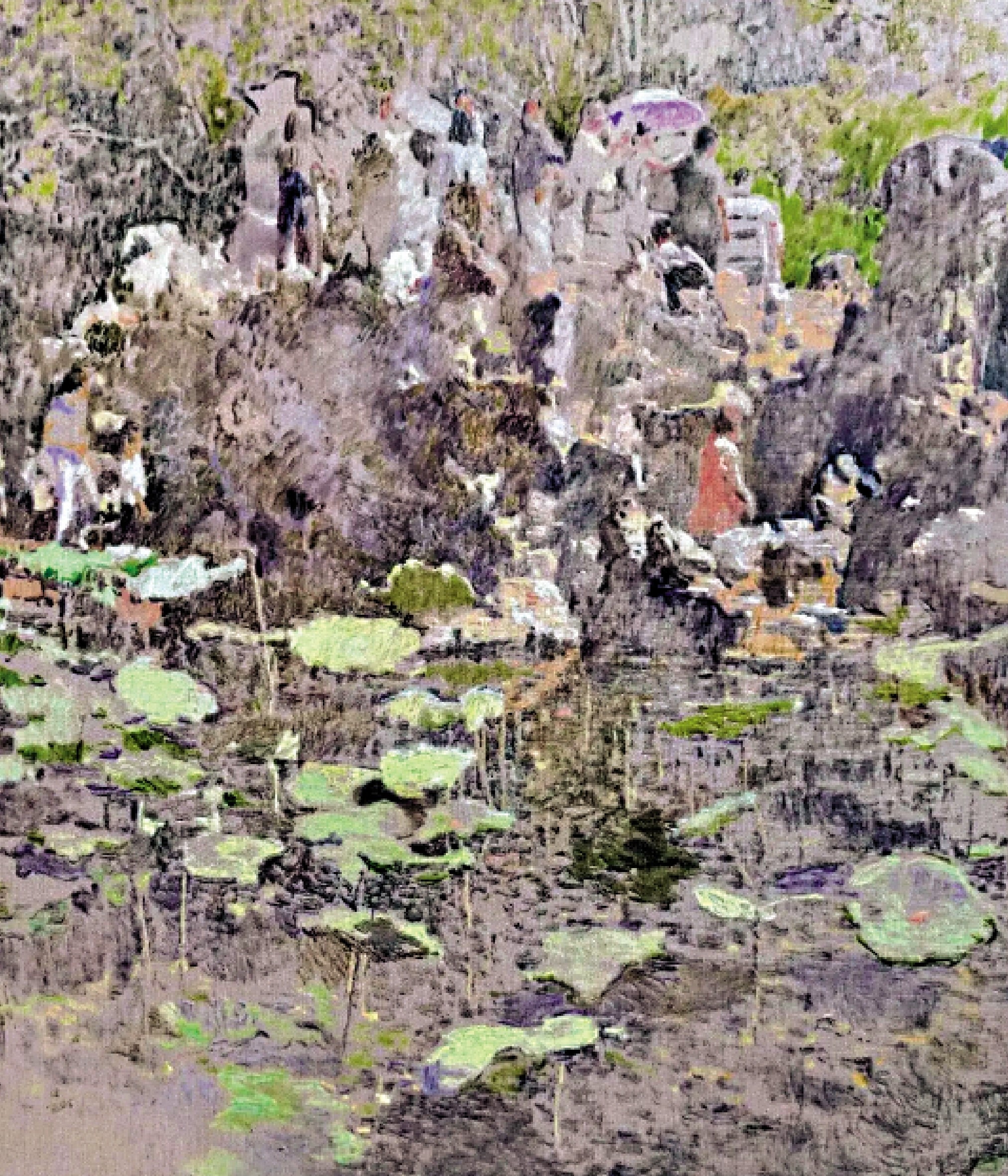 張淳筆下的園林,遠非復刻古畫,而是以當下語彙再思古典之美。他不再沿用傳統文人畫園林的淡墨簡筆,轉而運用西方油畫、水彩的豐富色彩與肌理,重構園林的空間與意境。畫中園林在色塊與筆觸的往來互動中若隱若現,湖石與花木在光影與色彩的變幻中,充滿生命的律動和想像。東方美學的含蓄與西方藝術色彩及情緒的張力,在畫中互為映照。觀眾彷彿真的走進了一座文人園林,既能望見古人的閒雅,也不乏當代性與實驗性的探索。