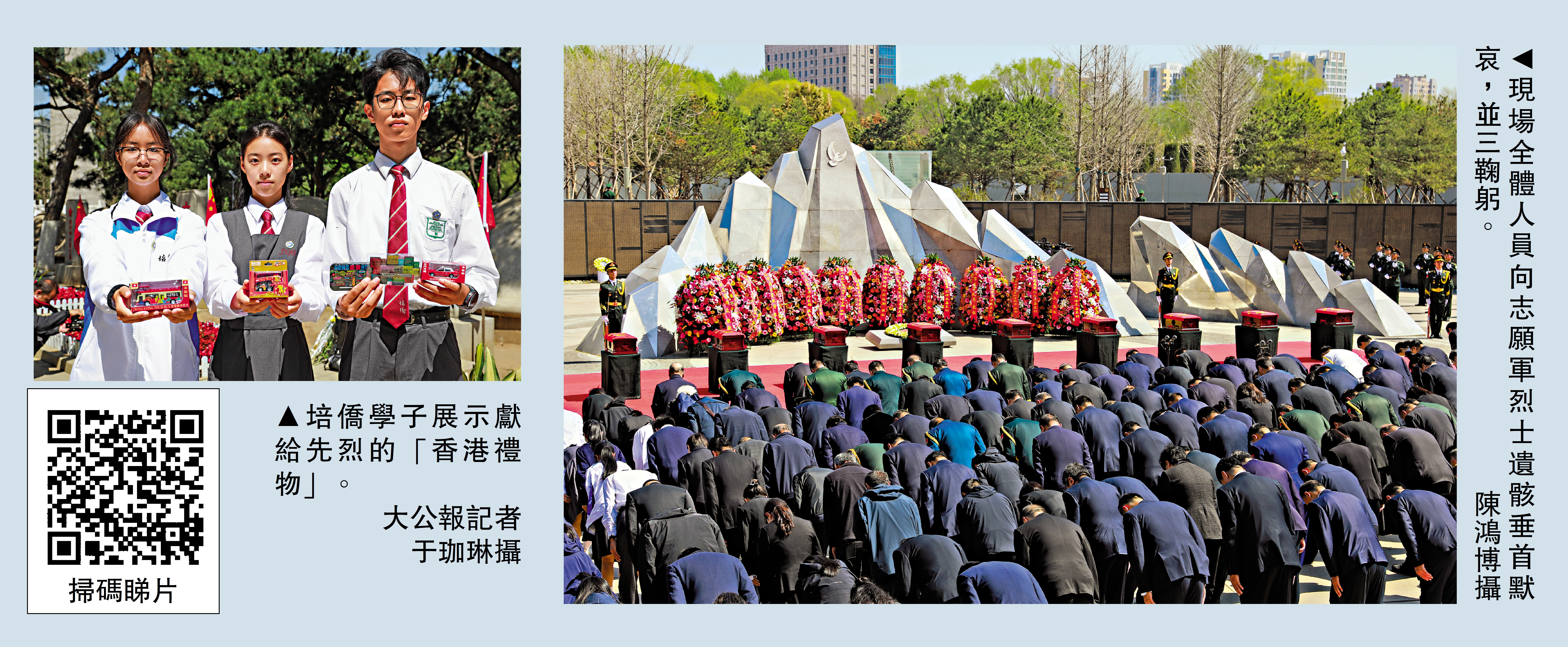 參與安葬儀式的香港培僑中學師生代表,延續了每年為烈士帶來「香港禮物」的傳統,不僅為烈士墓碑送上代表着香港煙火氣的巴士、霓虹燈牌、的士等,還特別在印有「培僑中學」的明信片上手繪一隻「和平鴿」,附上一首原創小詩。「少年不負凌雲誓,我輩同心築國昌。」在栩栩如生的和平鴿一旁,一代香港青年的心願躍然紙上。澳門坊眾學校高二學生李健豪將一朵菊花放在英名牆前,他說:「能參加今天的安葬儀式,我非常激動,心中滿懷對英烈的崇高敬意,也更加深刻體會到今日和平來之不易。」