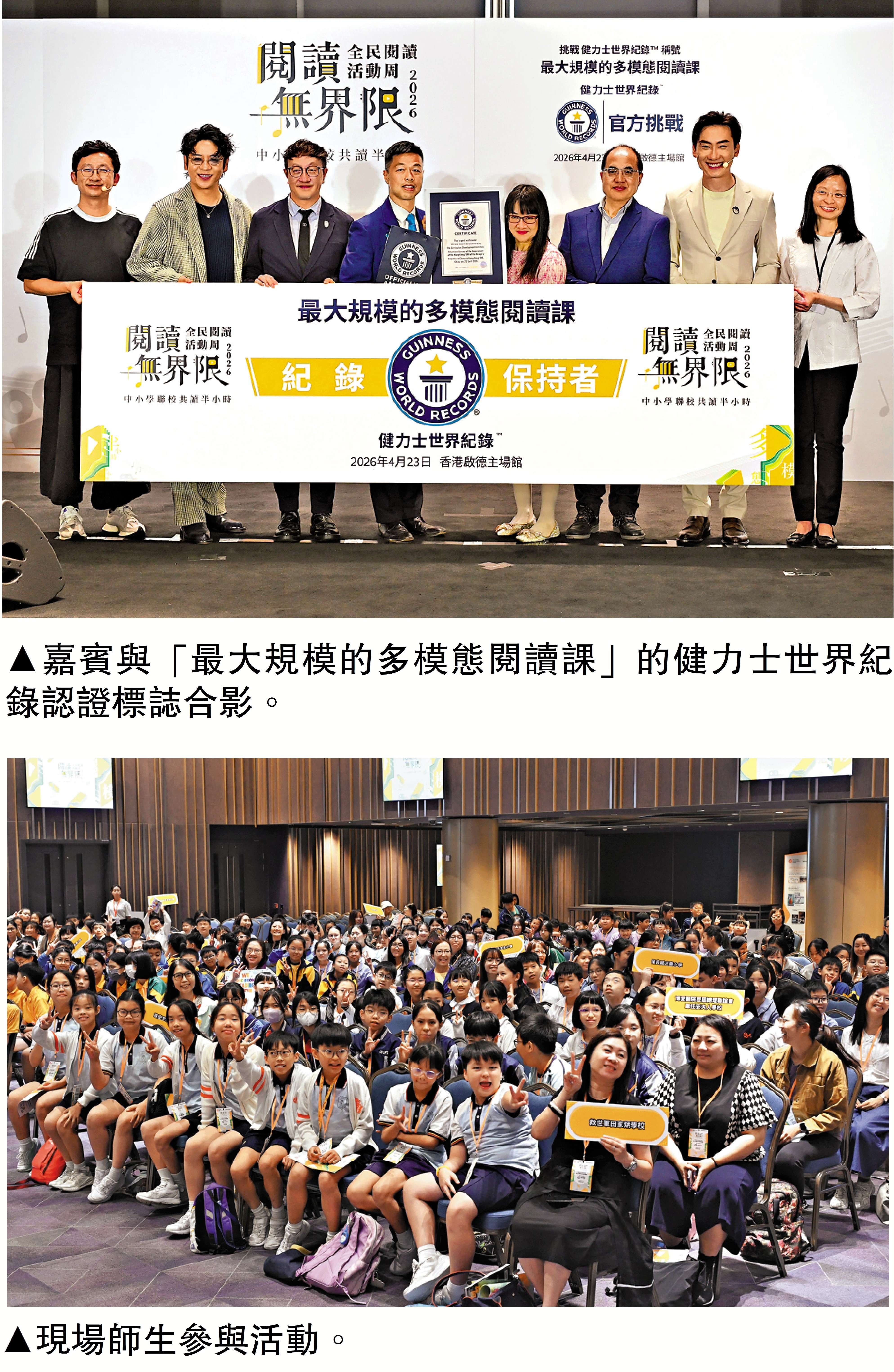 4月23日是世界讀書日。香港特區政府教育局當天在啟德體育園主場館內舉行「2026全民閱讀活動周──閱讀無界限分享會暨中小學聯校共讀半小時」活動,現場1119名師生同場閱讀,刷新「最大規模的多模態閱讀課」的健力士世界紀錄。\中新社