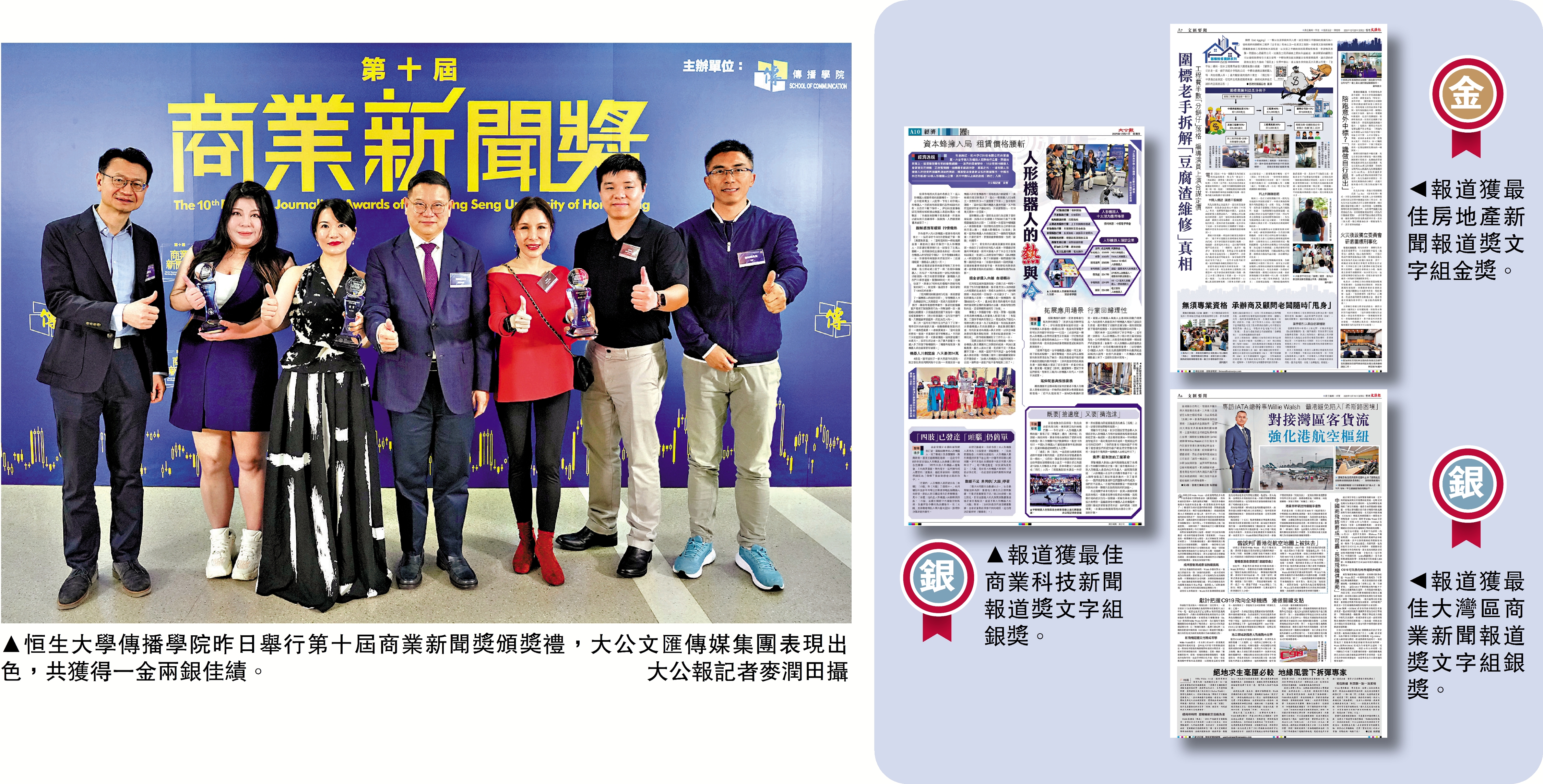 【大公報訊】由香港恒生大學傳播學院舉辦的第十屆商業新聞獎,昨日舉行頒獎典禮。香港大公文匯傳媒集團共奪得一金兩銀,其中《大公報》憑《人形機器人的熱與冷》獲最佳商業科技新聞報道獎文字組銀獎;《文匯報》憑《圍標老手拆解「豆腐渣維修」真相 工程費半數「分餅仔」落格 編導演員上演合謀定價》獲最佳房地產新聞報道獎文字組金獎、憑《專訪IATA總幹事Willie Walsh 籲港避免陷入「希斯路困境」 對接灣區客貨流 強化港航空樞紐》獲最佳大灣區商業新聞報道獎文字組銀獎。