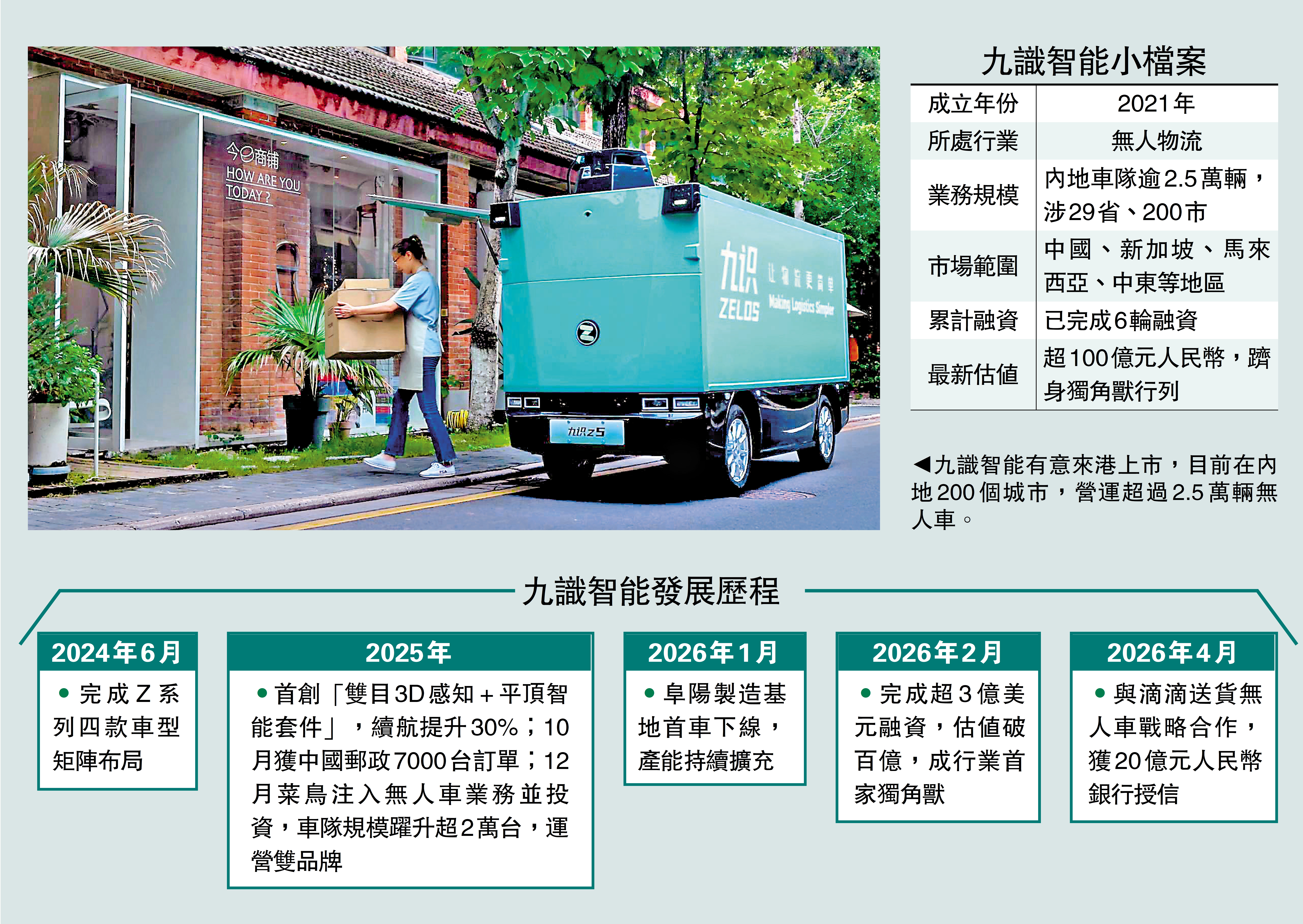 資料顯示,九識智能成立於2021年。它是全球最大的無人貨車營運商之一,提供配備L4級別自動駕駛技術的配送貨車。該公司在內地的車隊規模超過2.5萬輛,覆蓋29個省份、200個城市。這些車輛合共營運超過1200萬公里。