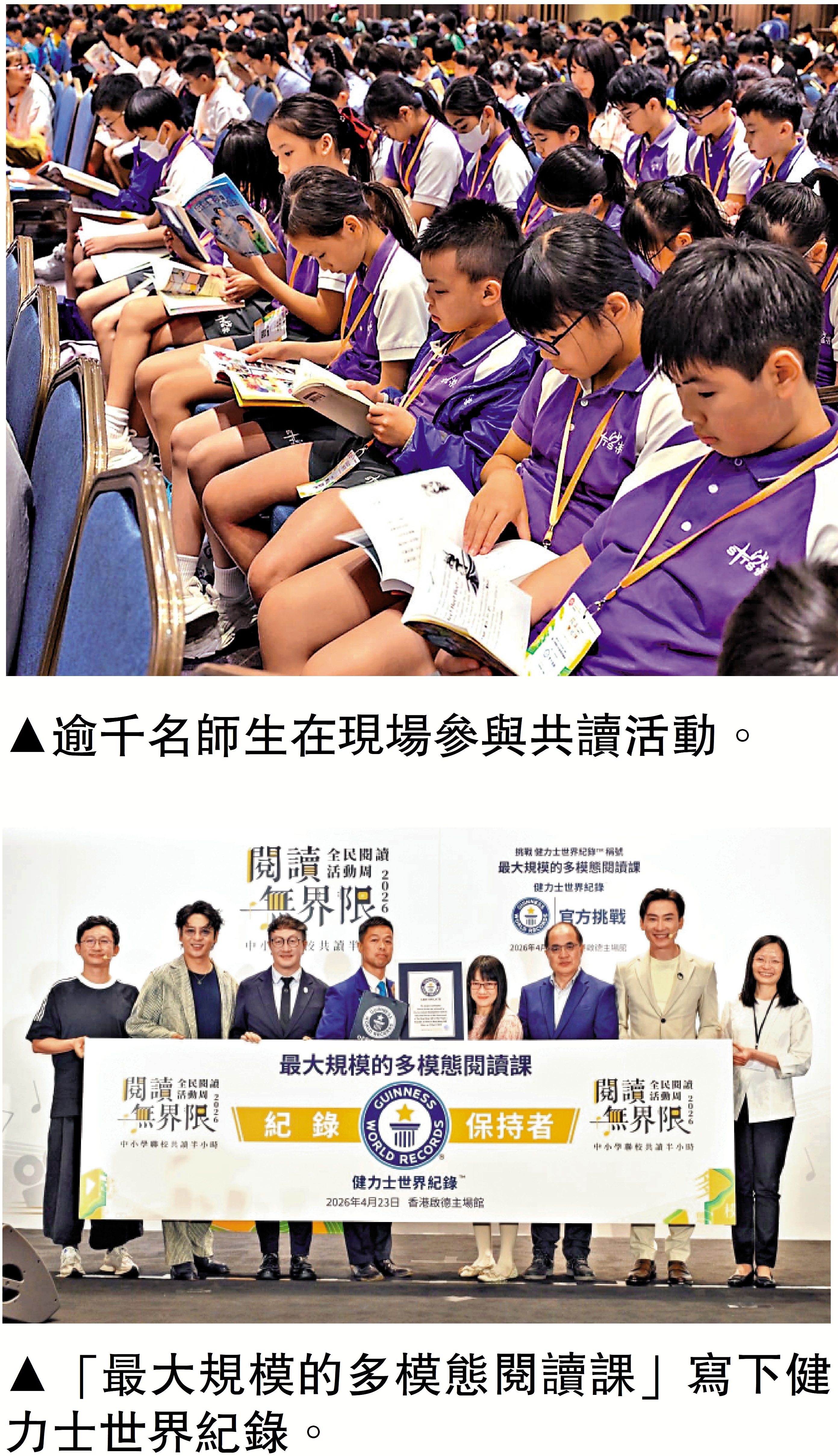 【大公報訊】記者郭如佳報道:昨日(23日)是世界閱讀日,亦是國家「全民閱讀活動周」,為響應「全民閱讀活動周」,教育局昨日在啟德體育園舉辦「閱讀無界限分享會暨中小學聯校共讀半小時」活動,吸引線上線下逾三萬名師生同步參與,共創「最大規模的多模態閱讀課」健力士世界紀錄。教育局局長蔡若蓮鼓勵同學抽出時間,多進行閱讀,形容「每一次閱讀都是一場心靈探險,每一本書都會帶我們看到不同世界」。