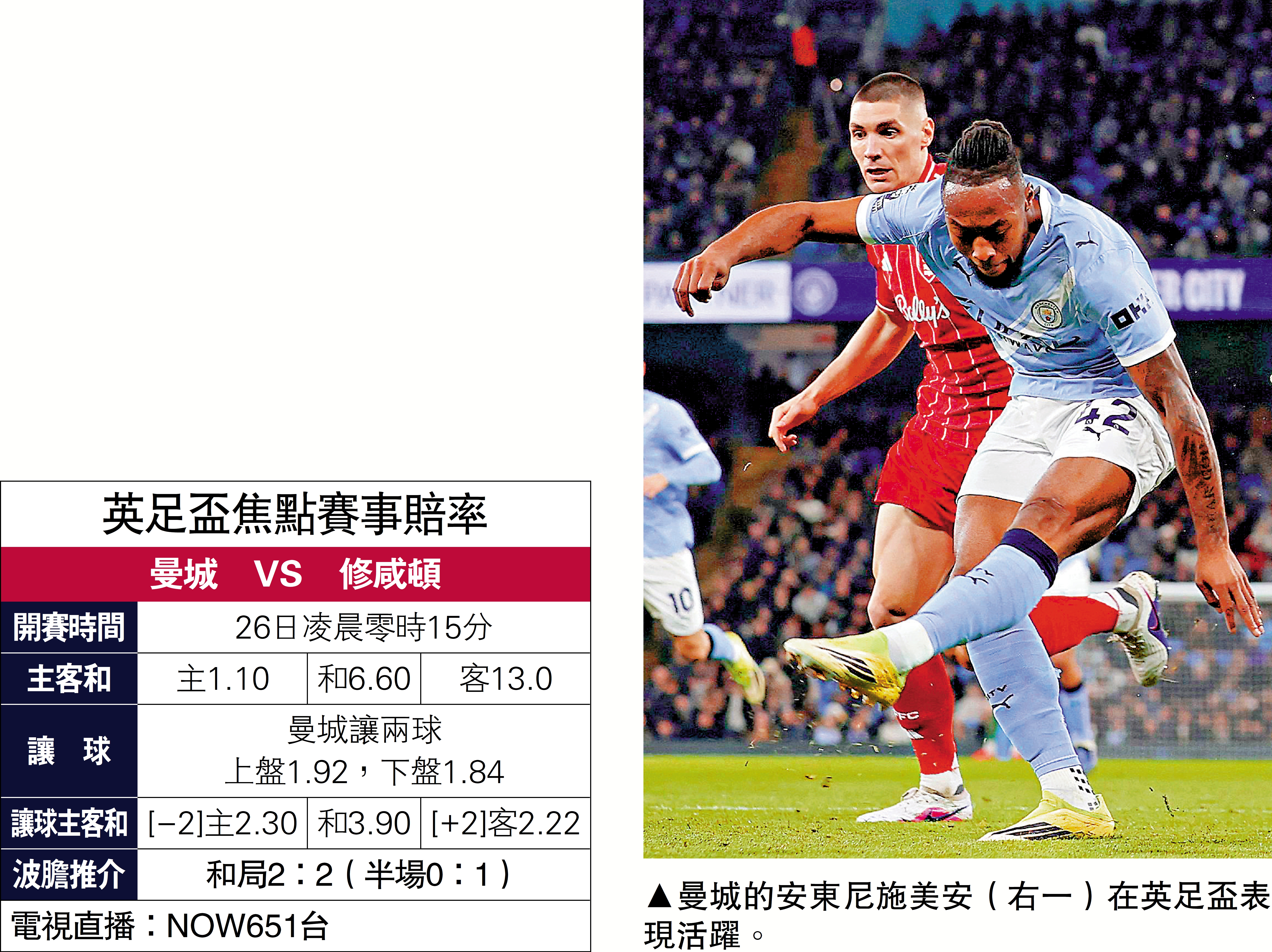 翻查雙方近年交手紀錄,曼城近10次對修咸頓取6勝3和1負,整體佔優。人腳方面,曼城冬季新援安東尼施美安在英足盃表現活躍,曾於對利物浦的8強戰建功,今場預計會是焦點人物;後防主力魯賓戴亞斯及中場核心洛迪卡斯簡迪今場上陣成疑。修咸頓前鋒甘馬倫阿奇近期亦屢有入球,多在比賽末段把握機會,今戰有機會對曼城造成威脅。(NOW651台26日凌晨零時15分直播)