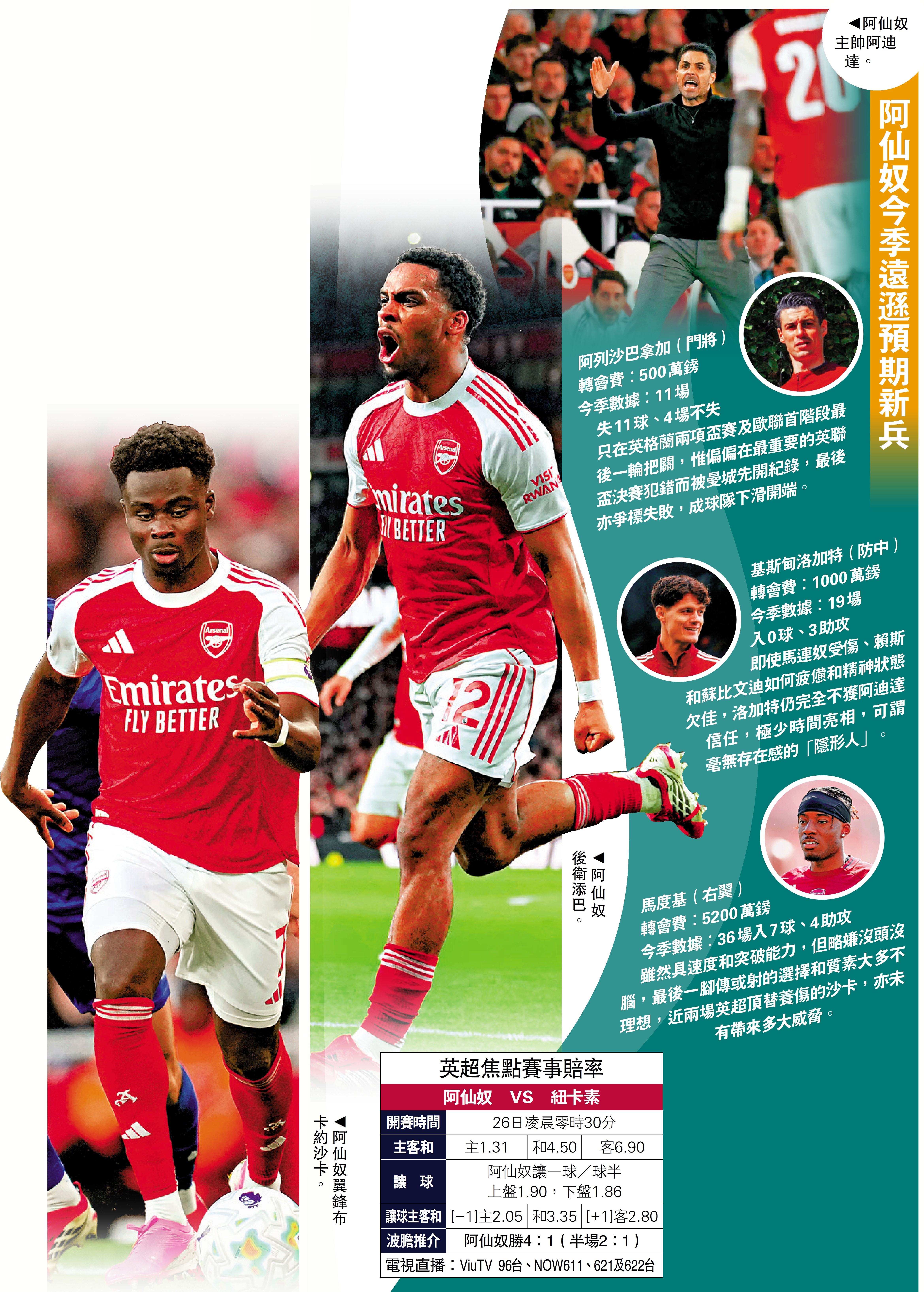 「兵工廠」阿仙奴2025年夏天斥資超過3億英鎊招兵買馬,目的是為加強板櫈深度,增添在各項賽事的爭標本錢。這些球員雖具備一定能力,然而在場上所演繹出來的效果,仍與一班舊主力有差距,例如上仗「英超決賽」雖不敵曼城,但在隊長馬田奧迪加特傷癒復出、夏維斯復任「箭頭」之下,整體進攻和壓迫明顯勝過英聯盃決賽,如今右路「命脈」布卡約沙卡與添巴亦接近復出,相信阿仙奴在英超和歐聯的雙線最後衝刺,還是要將希望放在舊將身上。\大公報記者 譚德龍