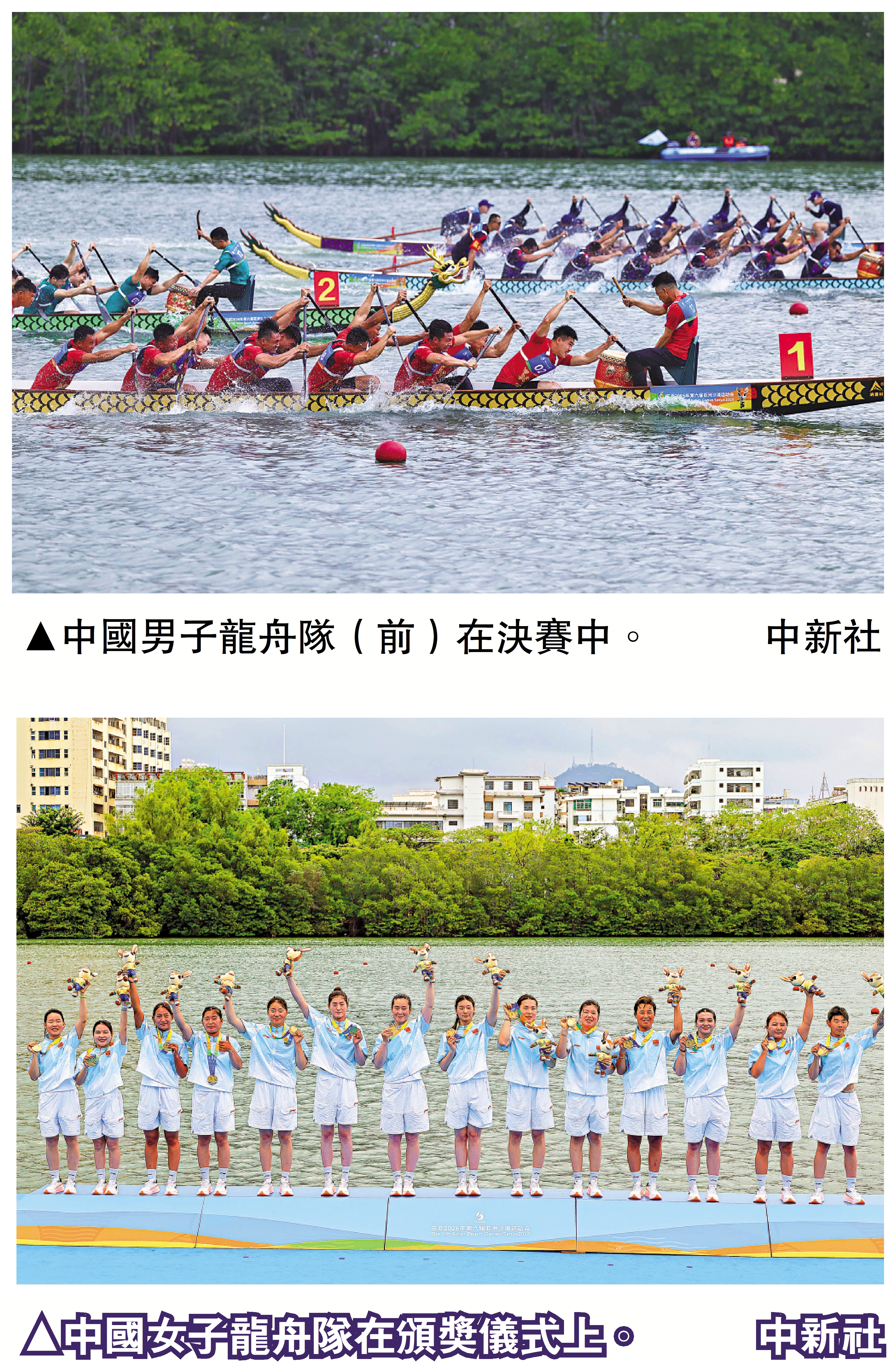 【大公報訊】據新華社報道:24日,在海南三亞舉行的第6屆亞洲沙灘運動會12人龍舟100米直道賽中,國家隊包攬男子組、女子組金牌。