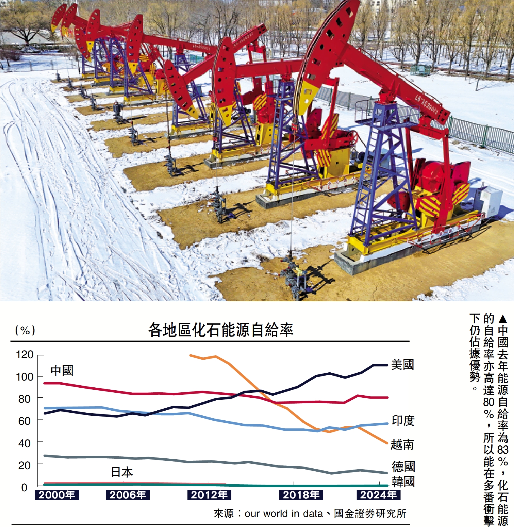 中國的能源結構以煤炭為核心,煤炭、石油、天然氣、核電和可再生能源的消費佔比分別為51.4%、18.2%、8.7%、21.7%。較高的煤炭和可再生能源消費比重對應了較高的能源自給率。2025年中國能源自給率(生產總量/消費總量)為83%,化石能源的自給率為80%,顯著高於越南、印度、德國、日本、韓國等國。