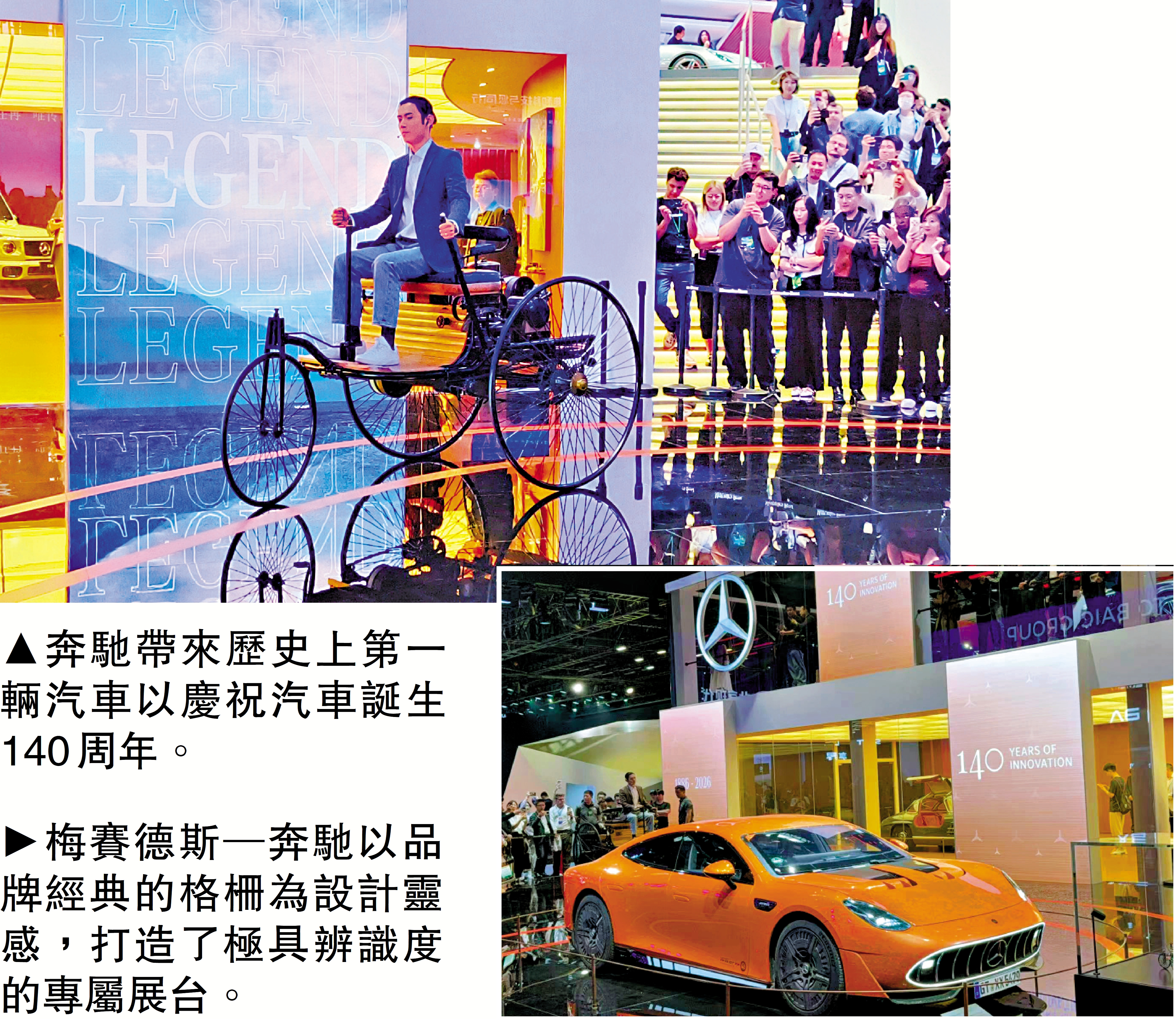 2026年正值汽車誕生140周年,梅賽德斯─奔馳在本屆展會以品牌經典格柵為設計靈感,打造了極具辨識度的專屬展台,並首次集結12款跨時代的傳奇座駕與珍貴展品,展開一幅跨越百年的創新畫卷。展品中既有1886年開啟人類出行新紀元的「奔馳一號」,也有1938年問世、被譽為車輪上傳世傑作的540K,有1954年首創鷗翼門設計的「最美奔馳」,還有率先搭載ABS系統的第五代S級轎車等。此外,經典的「大奔」——第七代S級「虎頭奔」也在現場亮相。