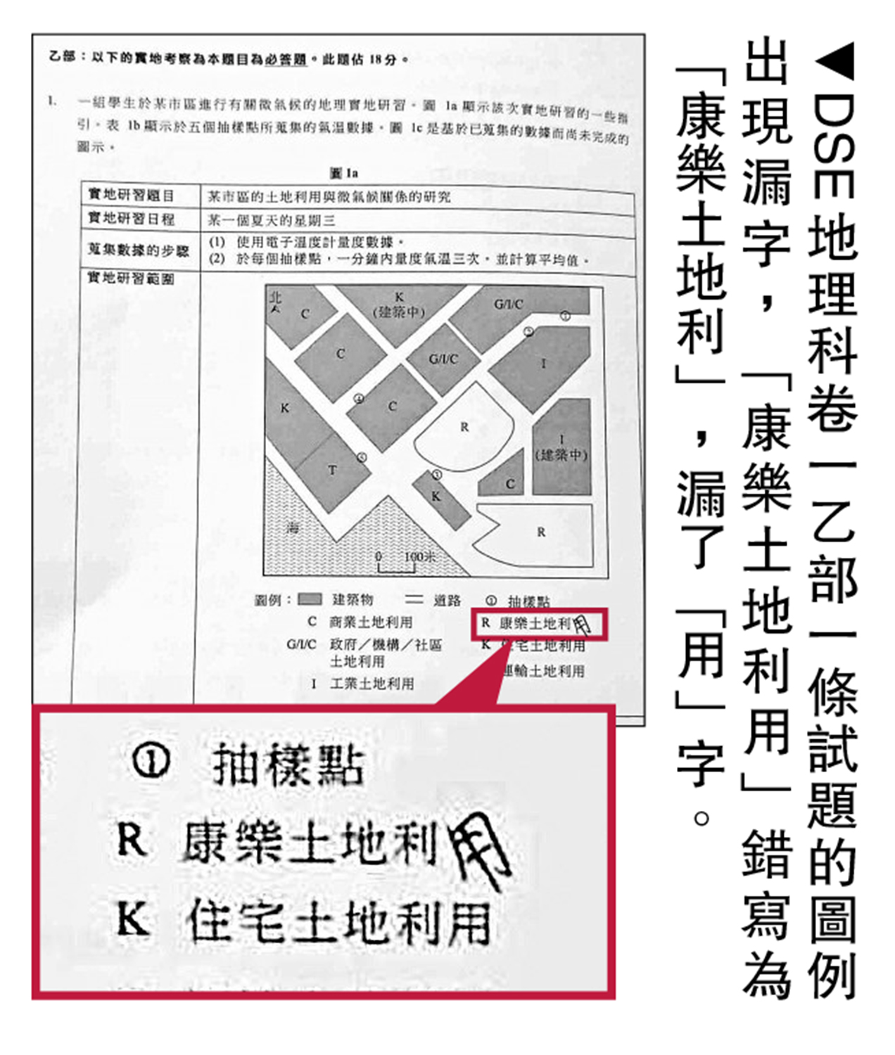 資料顯示,地理科中文卷卷一乙部一條試題出現漏字。該題模擬地理實地研習地圖,為地圖不同地塊表明土地用途,其中一圖例,將「康樂土地利用」漏寫「用」字,成「康樂土地利」。考評局事後表示,發現漏字後,已立即採取應變措施,通知試場主任向考生作更正宣布,在黑板展示更正,受影響試場完卷時間亦獲安排順延一分鐘。有地理老師指試題出現漏字是低級錯誤。