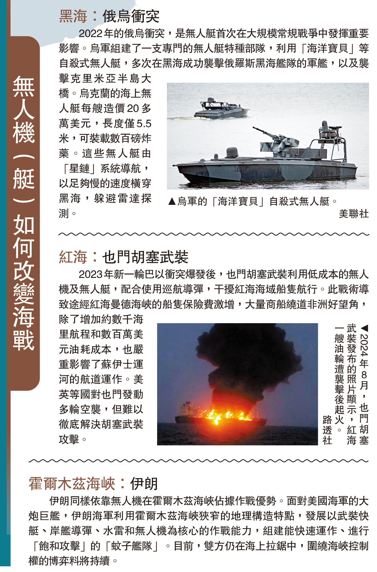 2022年的俄烏衝突,是無人艇首次在大規模常規戰爭中發揮重要影響。烏軍組建了一支專門的無人艇特種部隊,利用「海洋寶貝」等自殺式無人艇,多次在黑海成功襲擊俄羅斯黑海艦隊的軍艦,以及襲擊克里米亞半島大橋。烏克蘭的海上無人艇每艘造價20多萬美元,長度僅5.5米,可裝載數百磅炸藥。這些無人艇由「星鏈」系統導航,以足夠慢的速度橫穿黑海,躲避雷達探測。