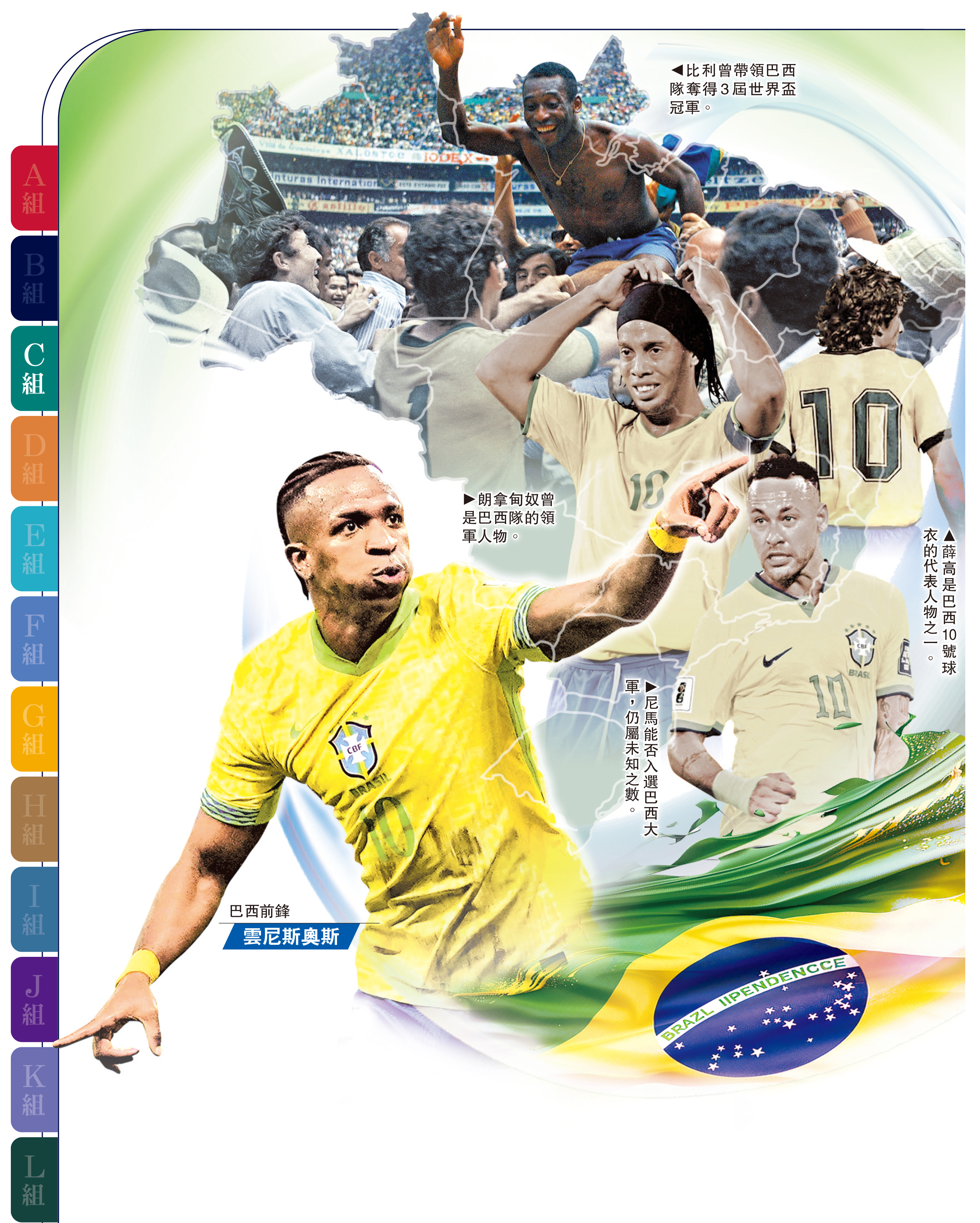 2026年美加墨世盃決賽周的C組焦點當然是「森巴兵團」巴西,這支史上奪得最多次冠軍的勁旅,與摩洛哥、蘇格蘭及海地同組。對巴西而言,重奪自2002年失落的「大力神盃」才是主要目標。以10號作為領袖角色的巴西來說,這個重擔相信落在皇家馬德里球星雲尼斯奧斯祖利亞身上。然而,他雖然球技出眾,但曾在重要關頭掉鏈子,令巴西隊爭標出現隱憂。\大公報記者 梁潤森