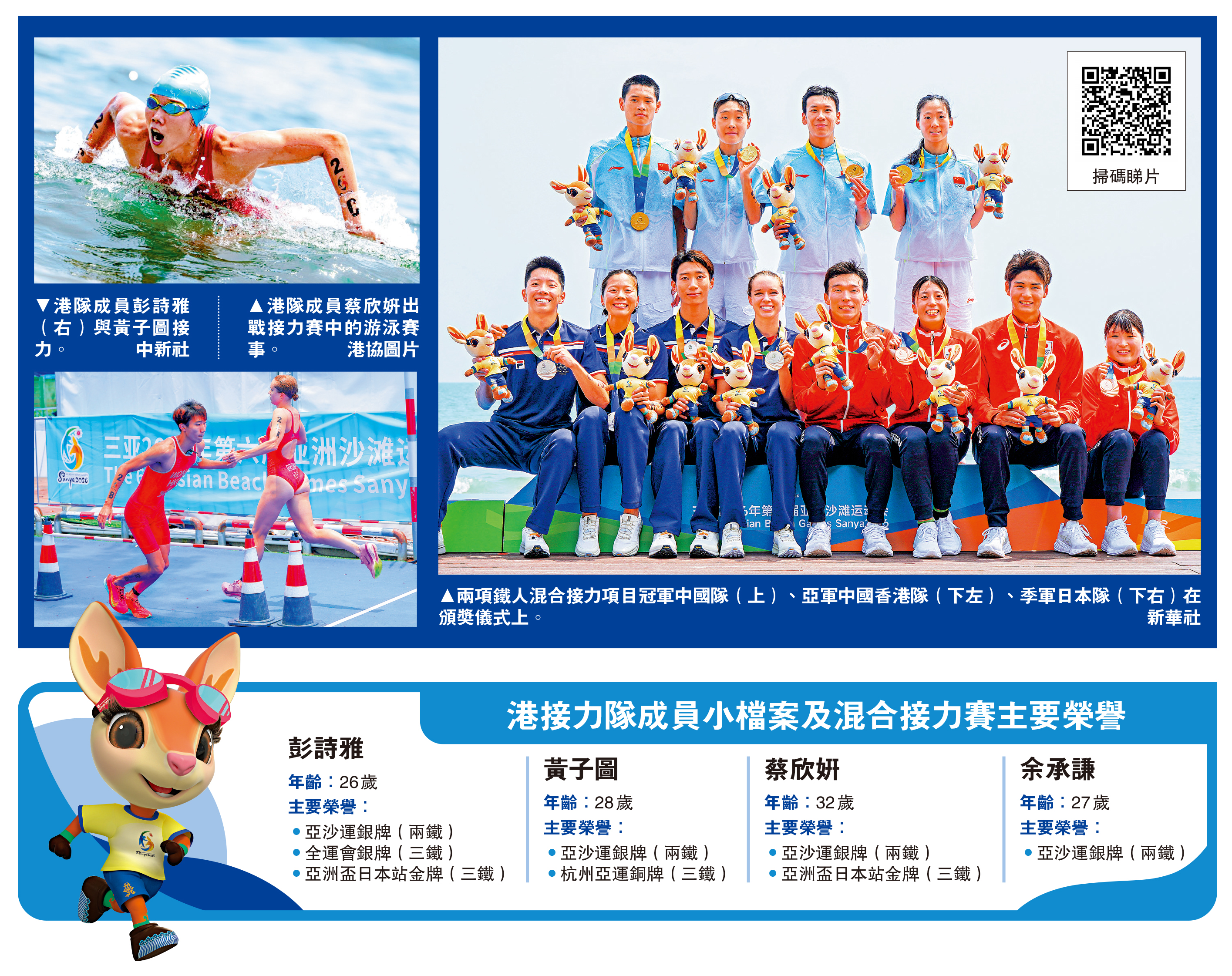 第6屆亞洲沙灘運動會的兩項鐵人混合接力項目決賽25日順利結束,由彭詩雅、蔡欣姸、黃子圖、余承謙組成的中國香港代表隊造出1小時02分35秒佳績,為港隊奪得今屆亞沙運的首枚獎牌,中國香港體育協會暨奧林匹克委員會副會長兼三亞亞沙運中國香港代表團團長楊頴新亦向獲獎運動員和教練團隊致以由衷祝賀。國家隊則以1小時1分44秒取得金牌,截至昨日賽事結束時國家隊暫以9金8銀2銅領先獎牌榜。\大公報記者 朱家立