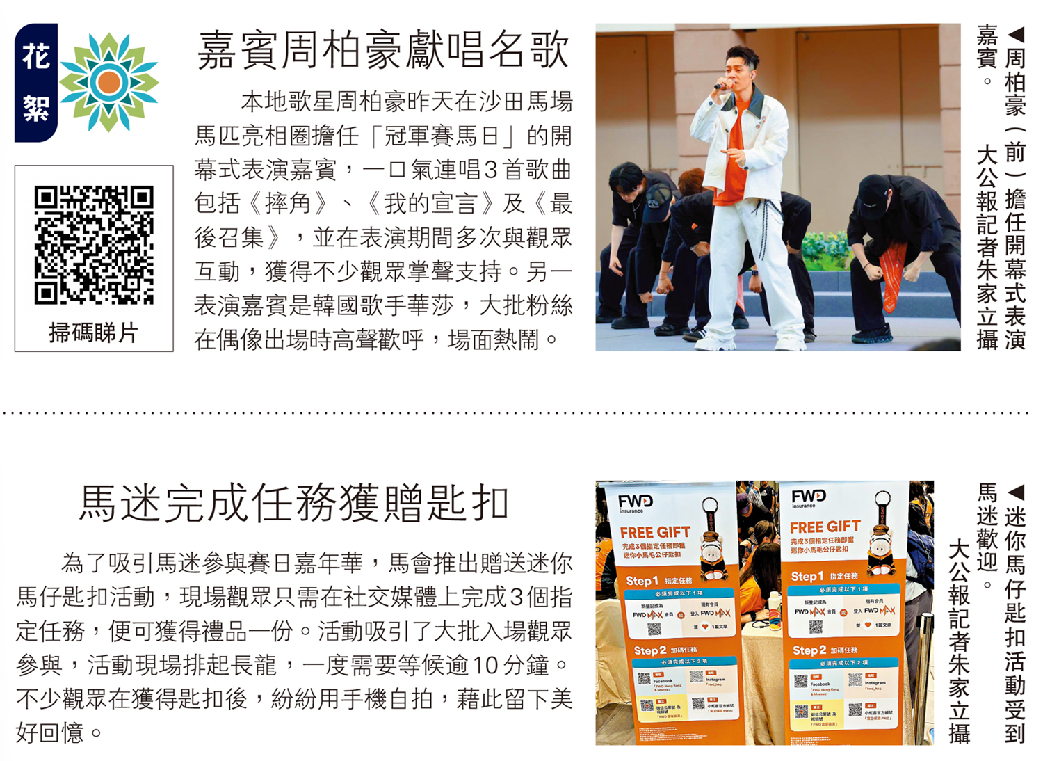 本地歌星周柏豪昨天在沙田馬場馬匹亮相圈擔任「冠軍賽馬日」的開幕式表演嘉賓,一口氣連唱3首歌曲包括《摔角》、《我的宣言》及《最後召集》,並在表演期間多次與觀眾互動,獲得不少觀眾掌聲支持。另一表演嘉賓是韓國歌手華莎,大批粉絲在偶像出場時高聲歡呼,場面熱鬧。