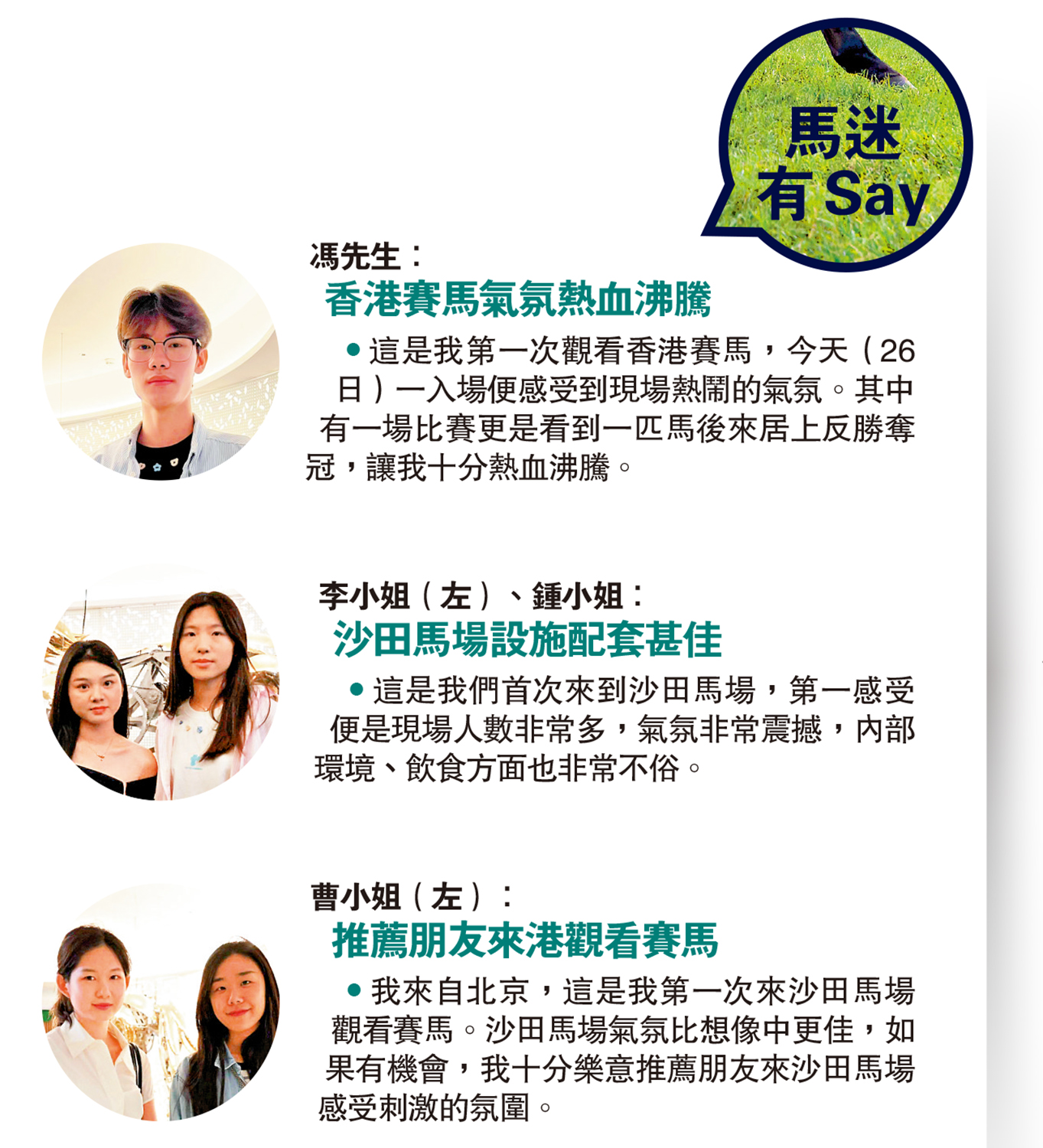 •我來自北京,這是我第一次來沙田馬場觀看賽馬。沙田馬場氣氛比想像中更佳,如果有機會,我十分樂意推薦朋友來沙田馬場感受刺激的氛圍。