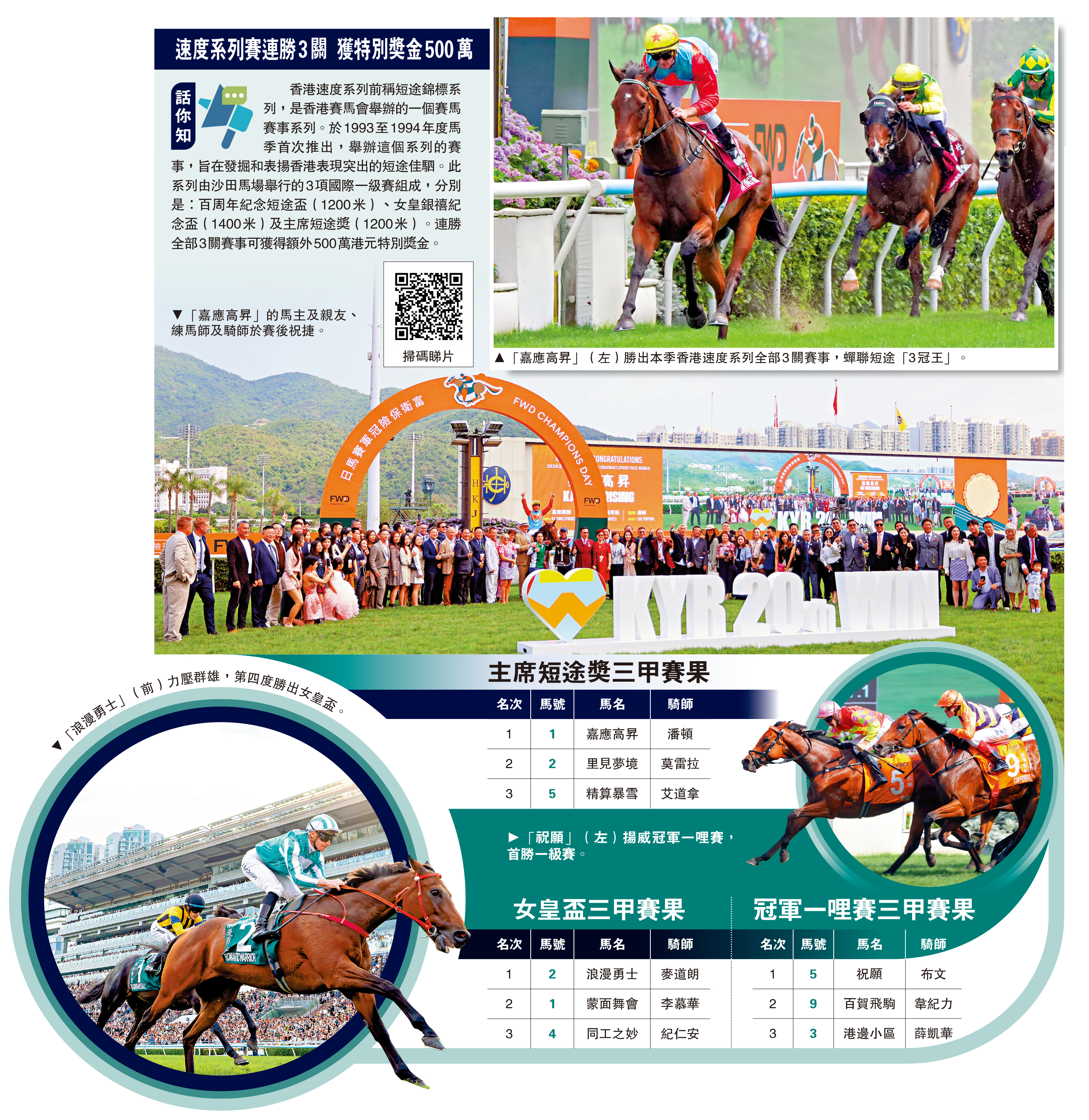 目前全球最佳賽駒、香港馬王「嘉應高昇」進一步印證在馬壇的非凡地位,26日以1分07秒10再次刷新沙田馬場1200米場地紀錄,勝出總獎金高達2400萬港元的一級賽主席短途獎,橫掃本年度馬季香港速度系列全部3關賽事,成功蟬聯短途「3冠王」,並將連勝紀錄進一步延伸至20場。同日,前香港馬王「浪漫勇士」破紀錄四度稱霸女皇盃,亦創歷史。\大公報記者 張銳、朱家立