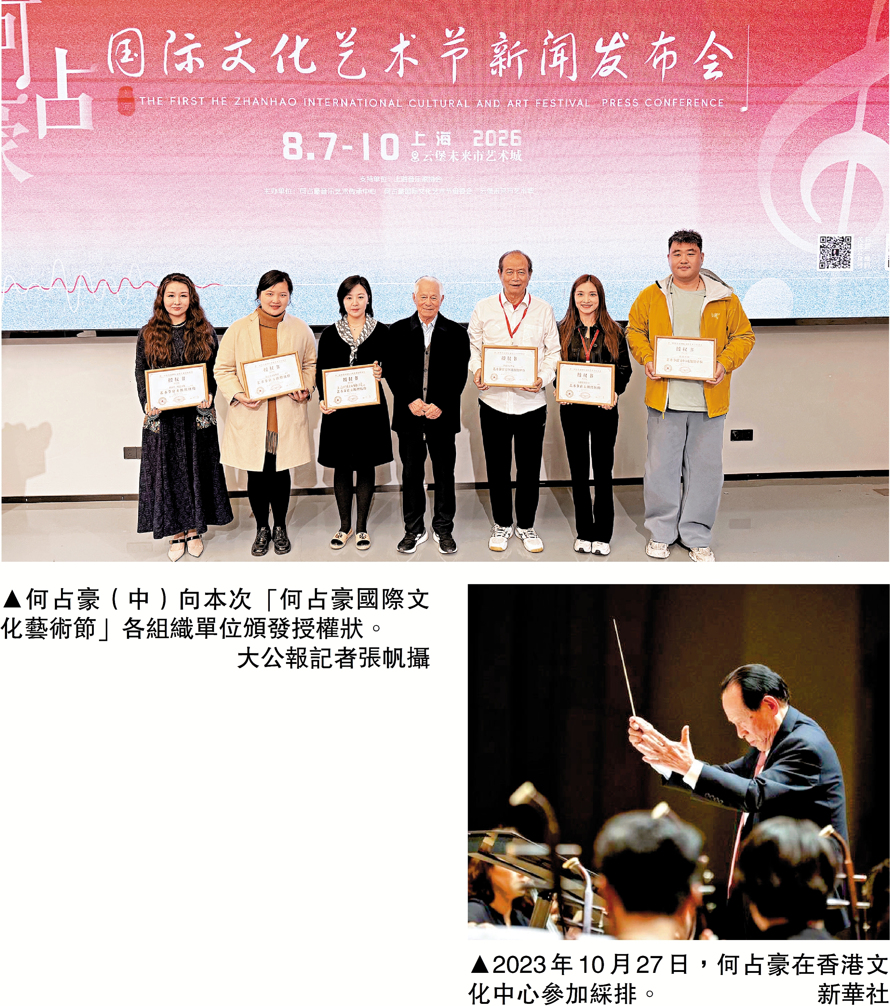 【大公報訊】記者張帆上海報道:由著名作曲家、音樂教育家何占豪領銜的首屆「何占豪國際文化藝術節」日前在滬啟動,藝術節以「傳承經典、守正創新」為主題,踐行何占豪「外來形式民族化,民族音樂現代化」的藝術理念,讓國樂扎根大眾、走向世界。記者了解到,香港演藝中心等機構亦是本次藝術節的組織單位。6月,組委會還將南下大灣區推廣交流,以增進港澳與內地音樂愛好者特別是青少年的交流,共同弘揚中華優秀文化。